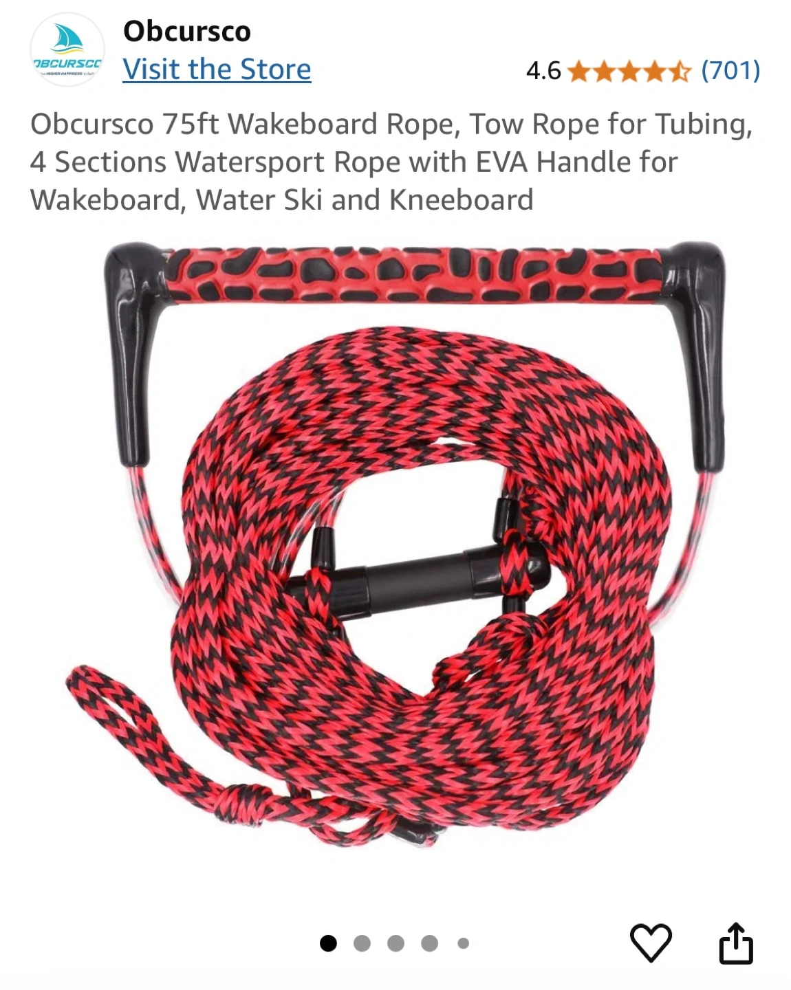 Buy & SellObcursco 75ft Watersport Tow Rope with EVA HandleObcursco 75ft Watersport Tow Rope with EVA Handle$3075-foot watersports rope. Four sections. EVA handle. For tubing, wakeboarding, waterskiing, and kneeboarding.WHERE TO MEETCheck LocationView MapSELLERverifiedElviraYonge Eglinton1175 reviews0 chats·0 favorites·10 viewsSEND CHAT TO SELLERHi Elvira! I’m interested in your listing.Hi Elvira! I’m interested in your listing.Get the Karrot app to chatSign In to chat