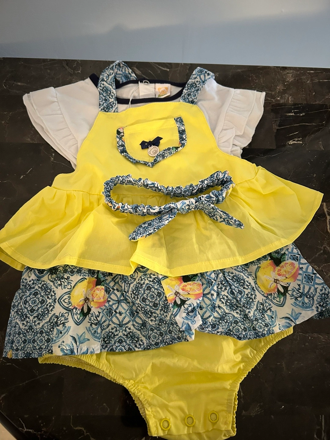 Three-piece baby girl outfit. Includes a yellow layered romper with lemon print, white ruffled short-sleeved shirt, and matching headband. Size 24 months. Perfect for summer. From Italy.