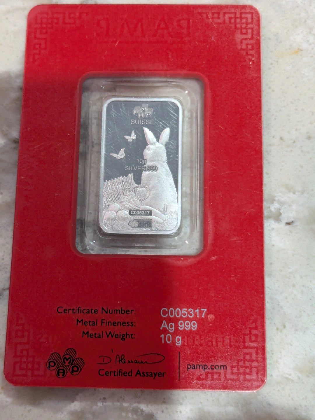 10 gram .999 fine silver bar. Part of the 2023 Lunar Calendar series. Features a rabbit design. Comes in original packaging. Certificate number included.