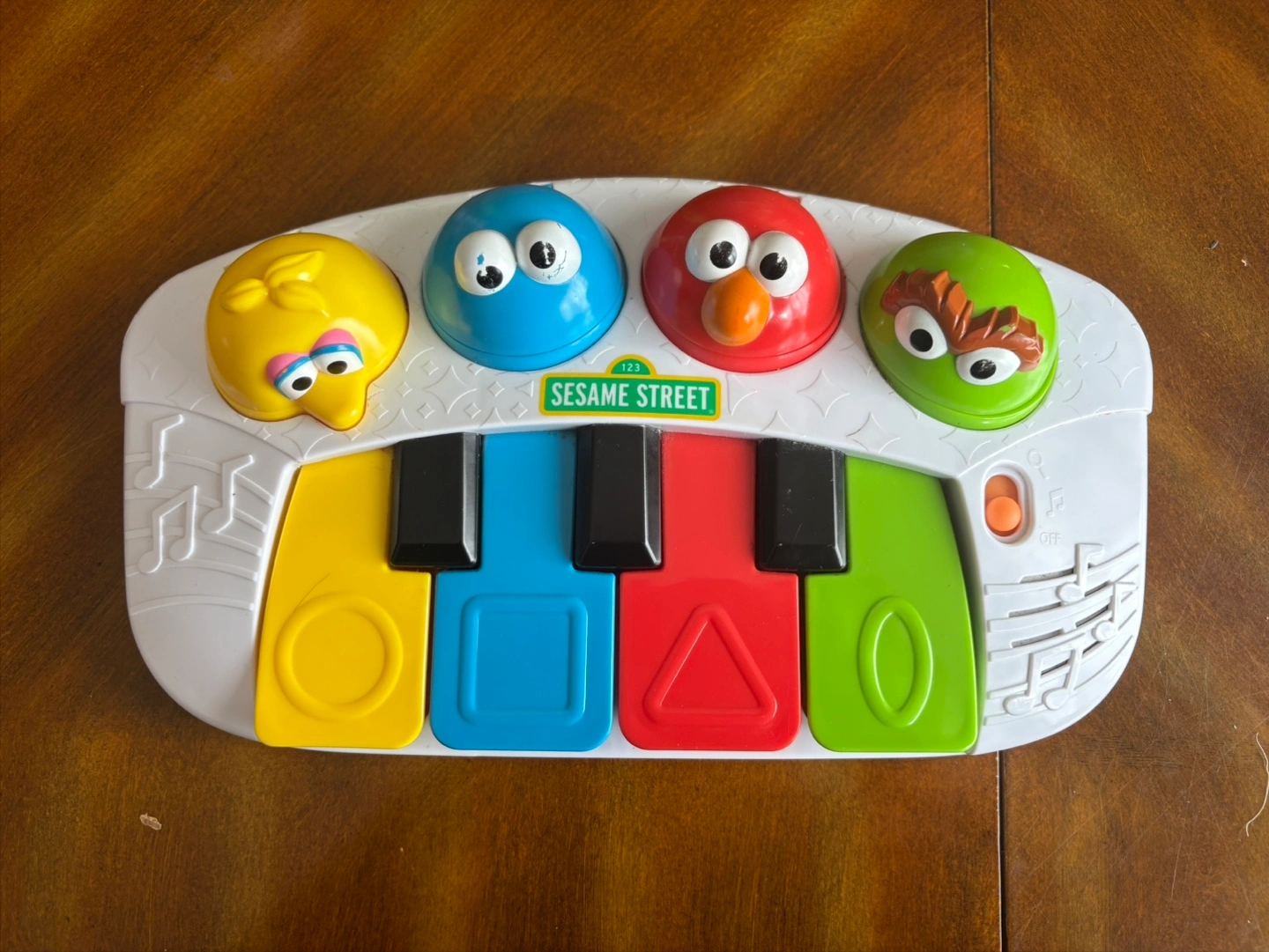 This is a used Sesame Street piano toy, great for toddlers to learn shapes and sounds. It has been well-loved but is still in good working condition, ready to bring joy to a new little musician!