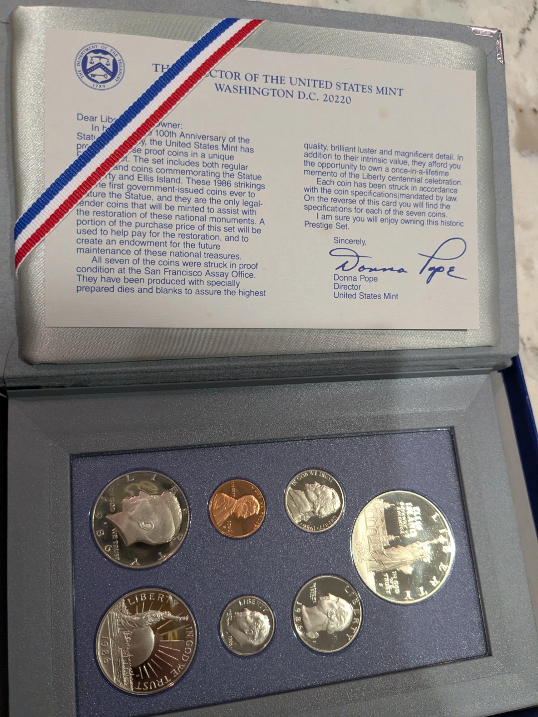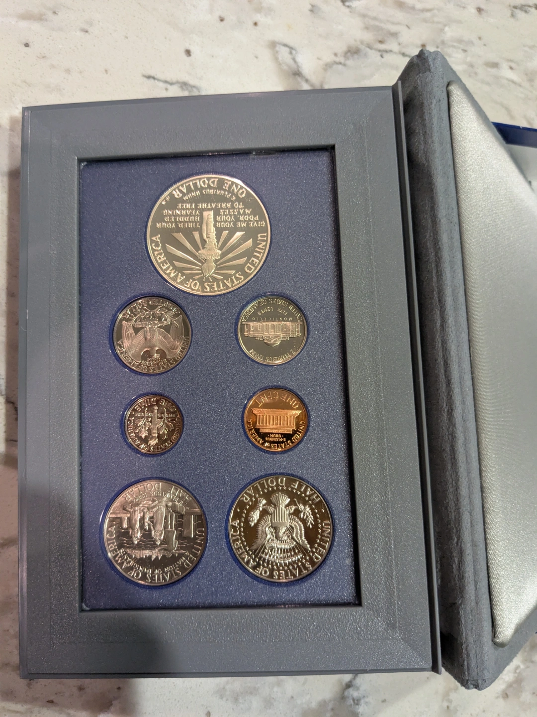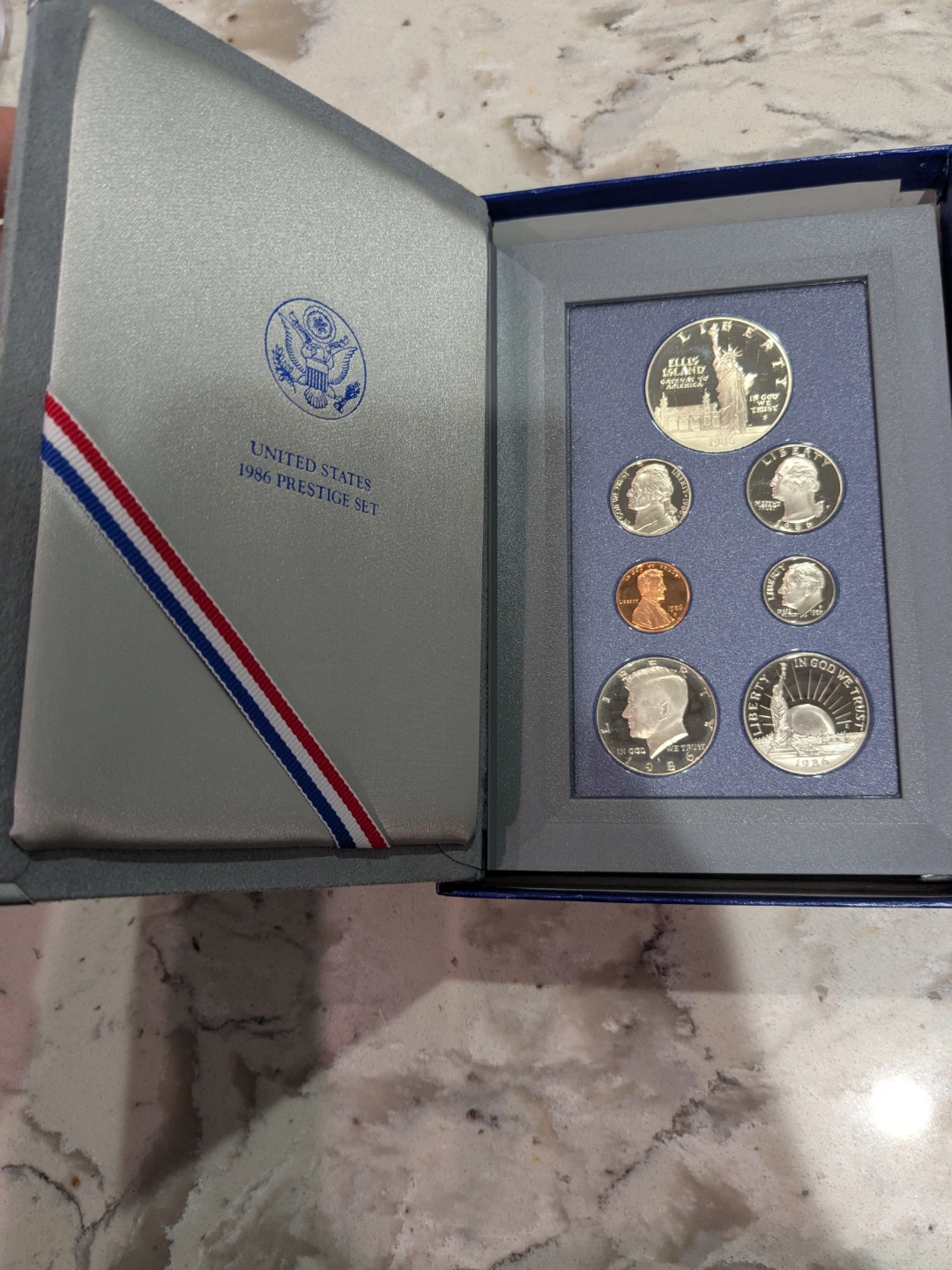 1986 United States prestige Proof Set of 7 coins including Ellis Island Liberty 90% silver dollar weight 26.730 grams.