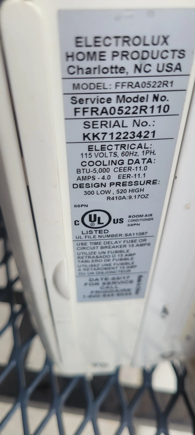 Used Frigidaire window air conditioner. Model FFRA052R1. missing 1 side panels. Good working condition.