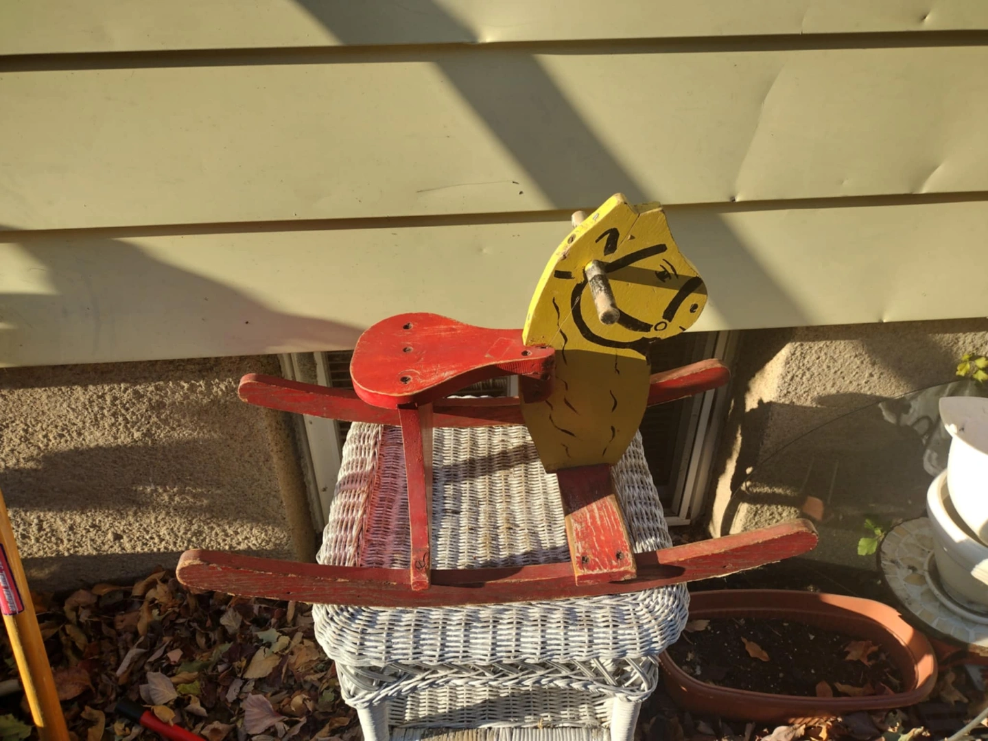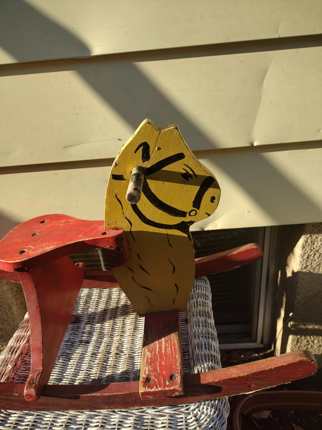 Adorable vintage wooden rocking horse. Red and yellow paint. Shows wear from age and use. Great for a child's room or collector.
