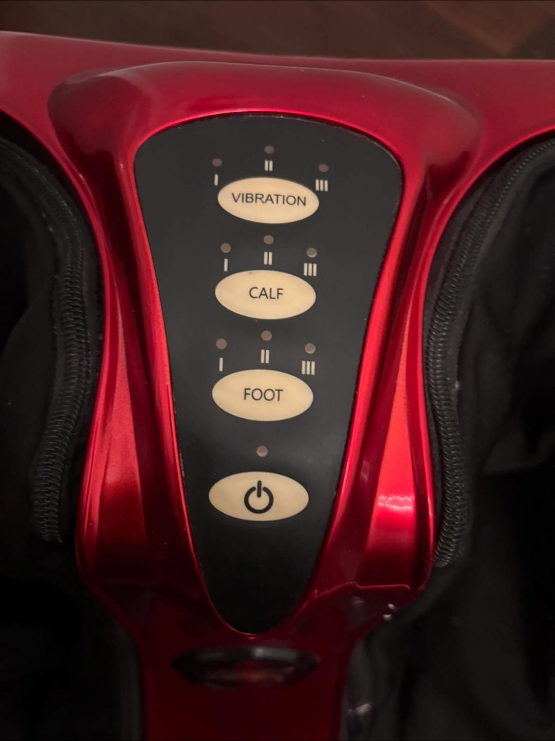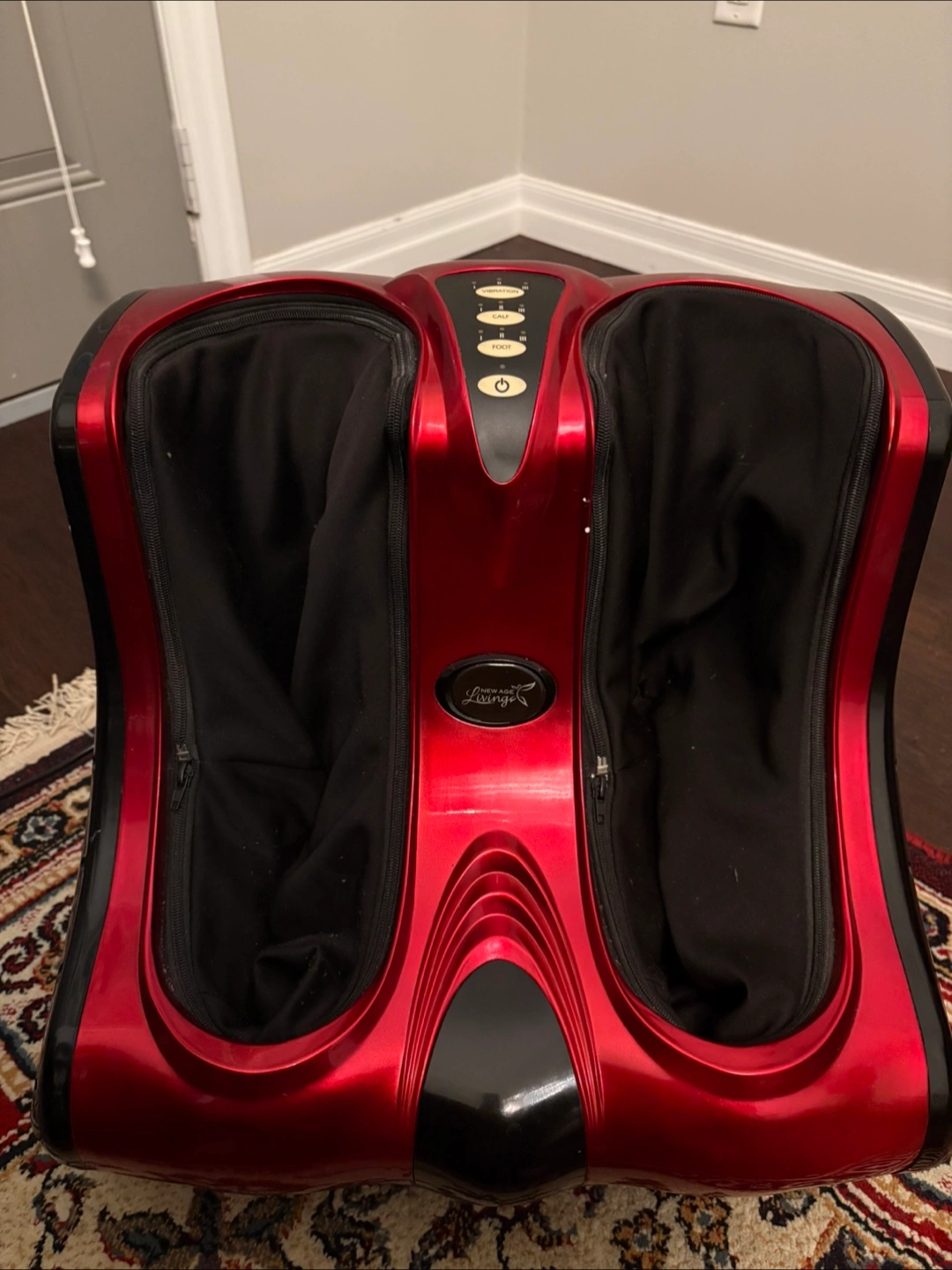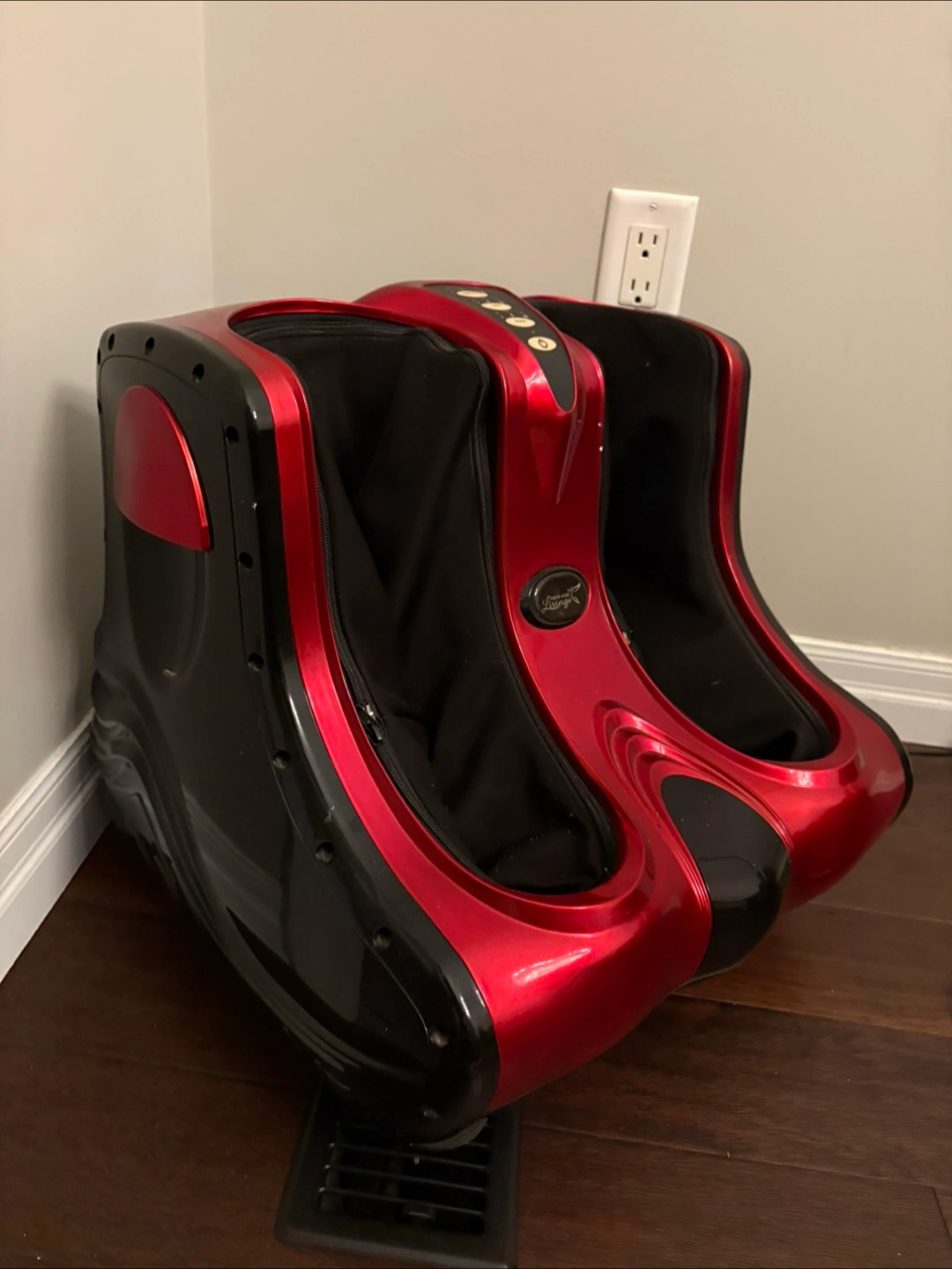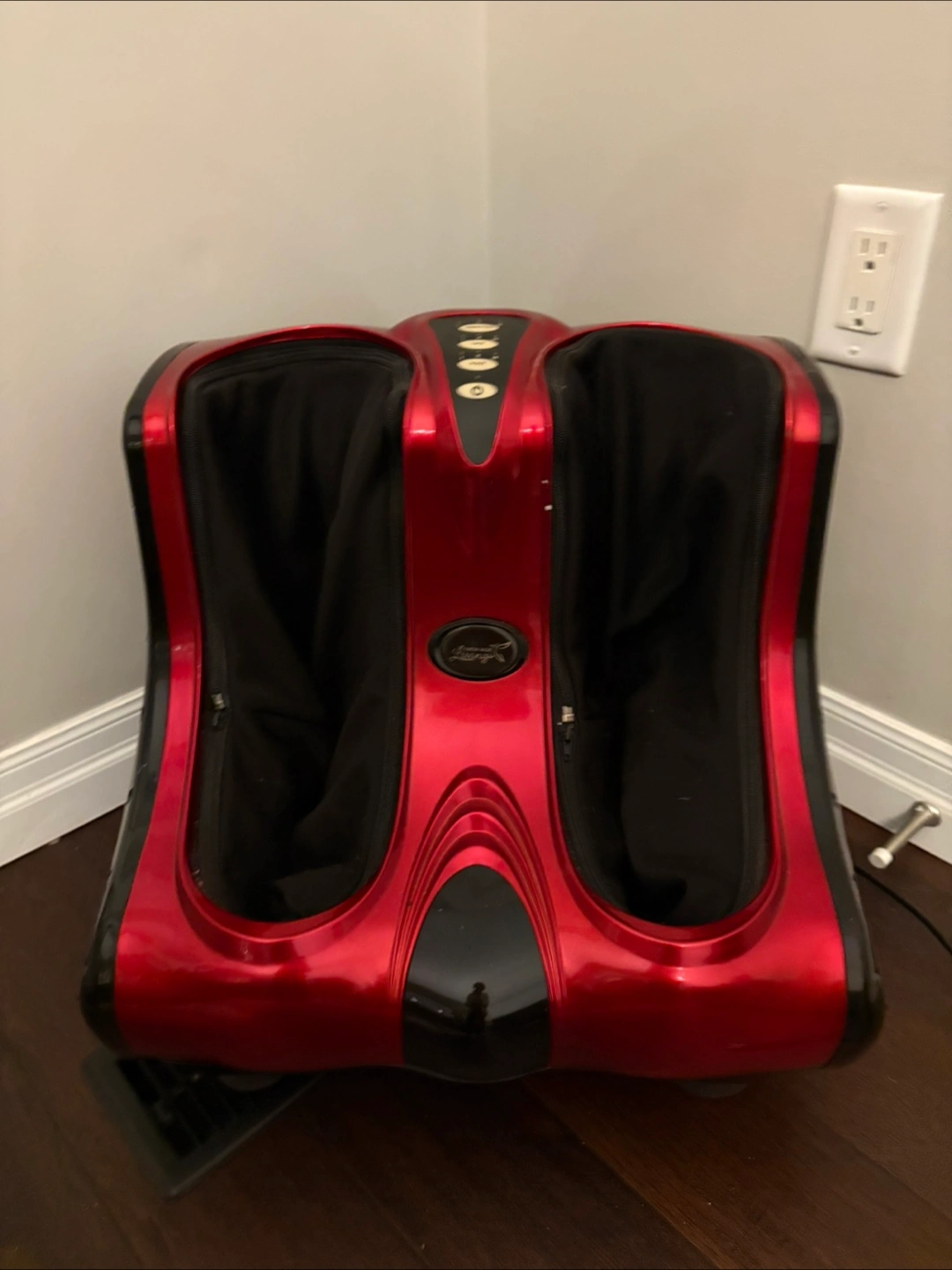 Red and black foot and calf massager. Multiple intensity settings. Great for relaxing after a long day. Features vibration.