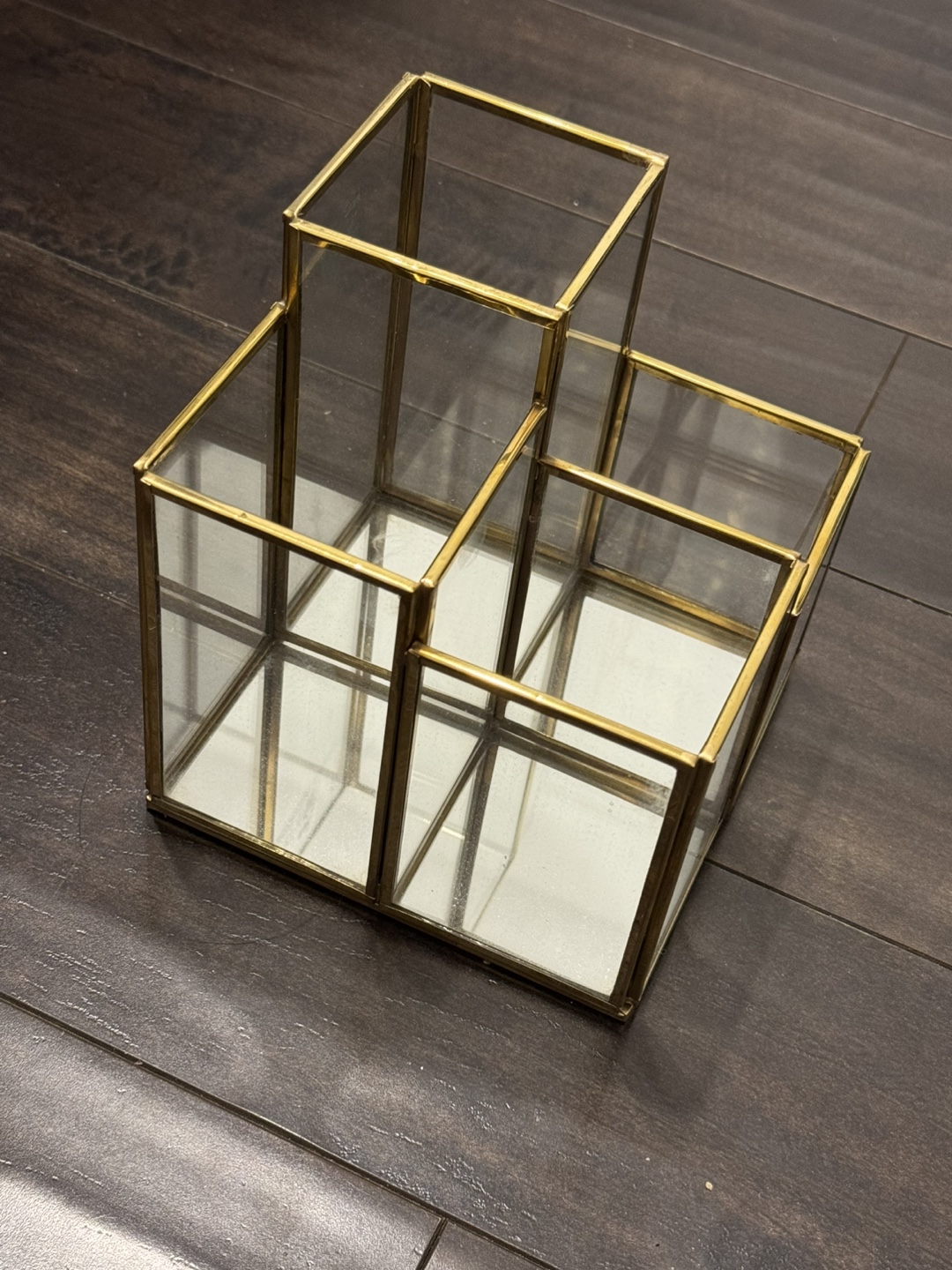 Four-section desk organiser. Glass containers with a gold metal frames made with brass and a mirrored bottom. Perfect for pens, pencils, or makeup brushes. Made in India.