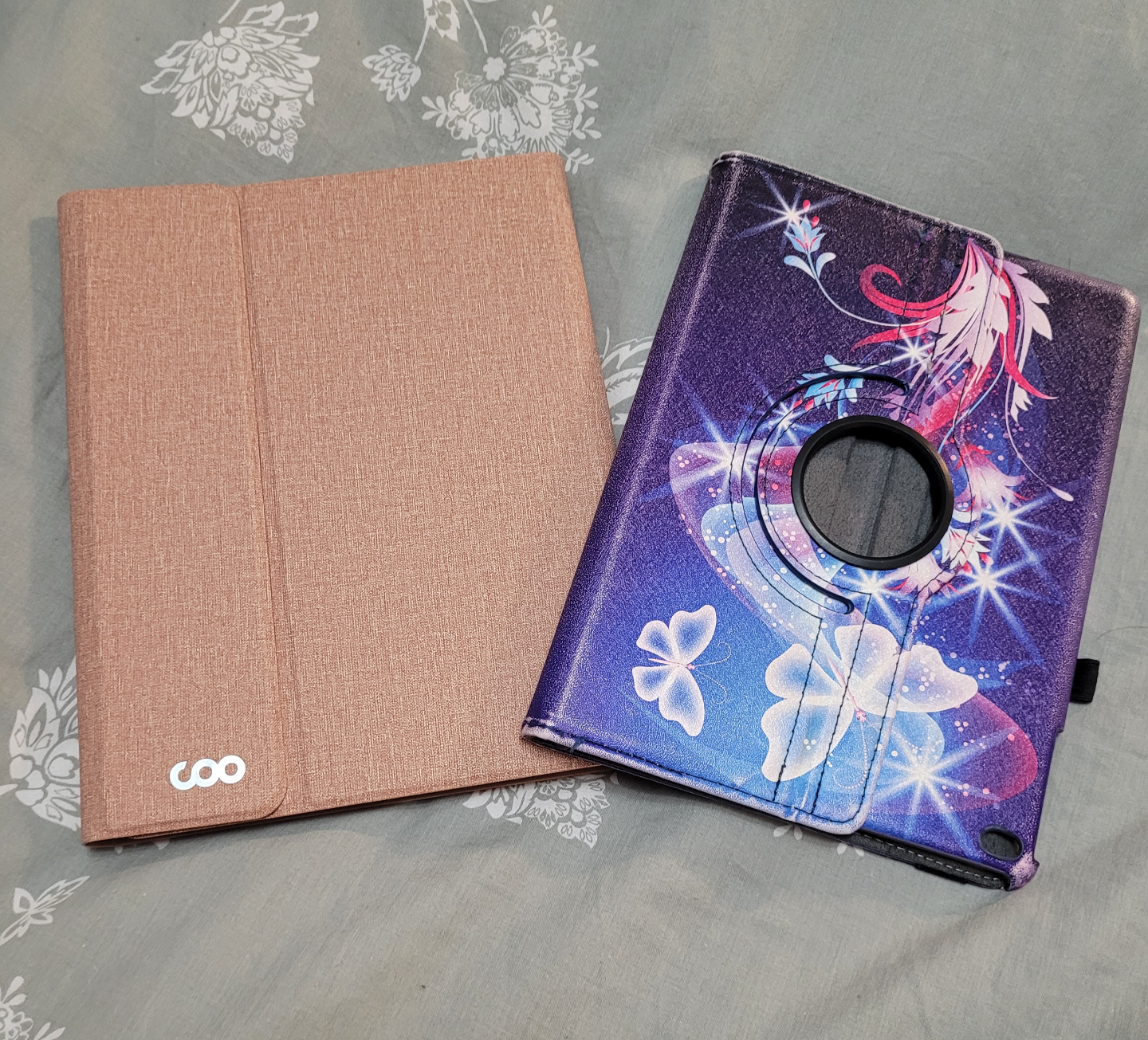 Two used tablet cases. One pink, one purple with butterfly design. Good condition.