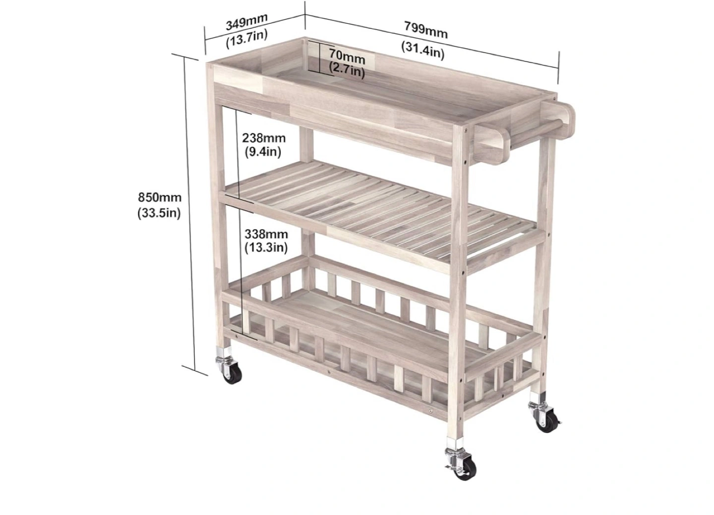 "Kitchen Utility Cart: The 799L*349W countertop gives you extra room to hold a microwave or prepare meals and dine; the two bottom shelves extend the storage space in your kitchen especially the slatted design for better ventilation. "