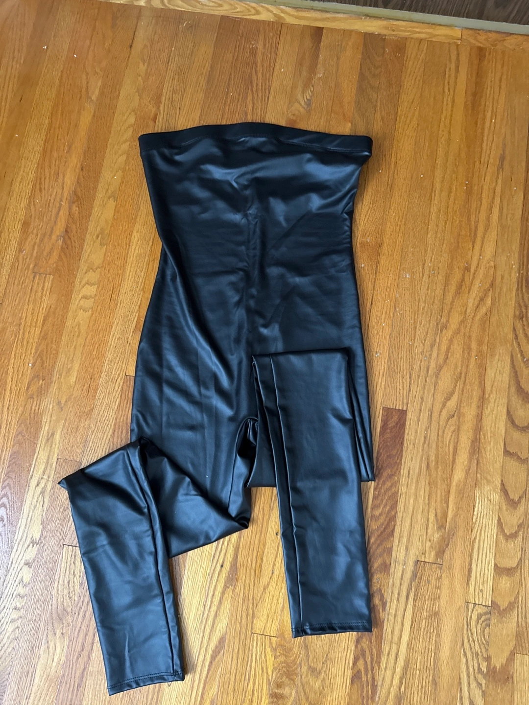 Strapless jumpsuit. Black faux leather. Long legs. Form-fitting.