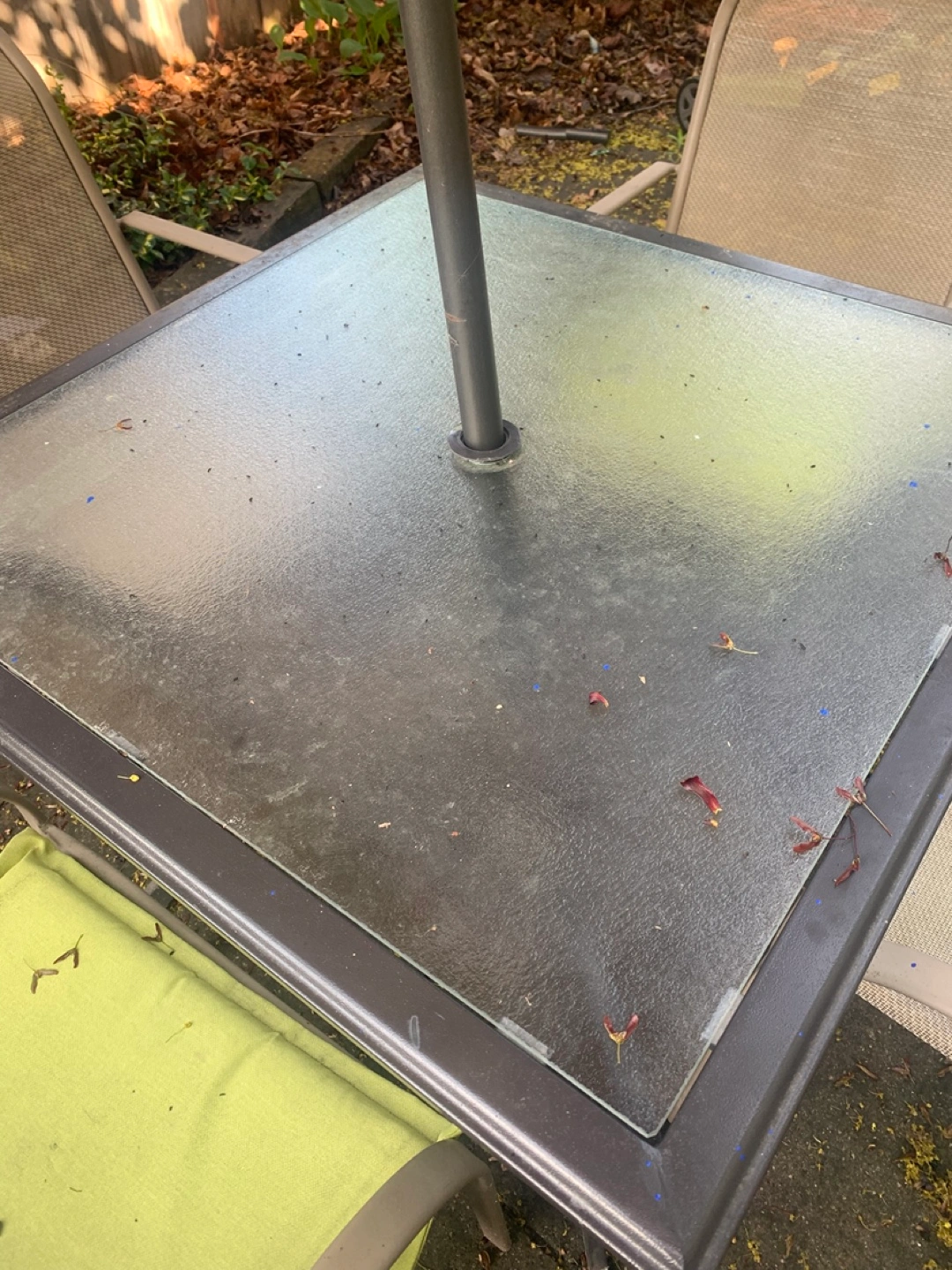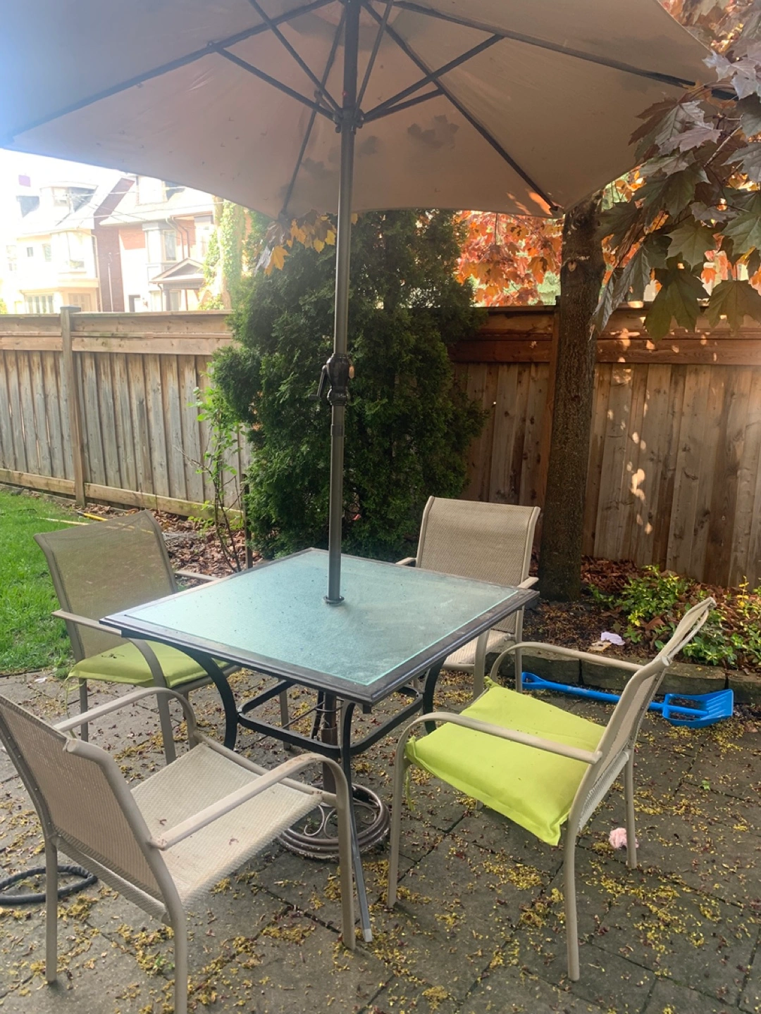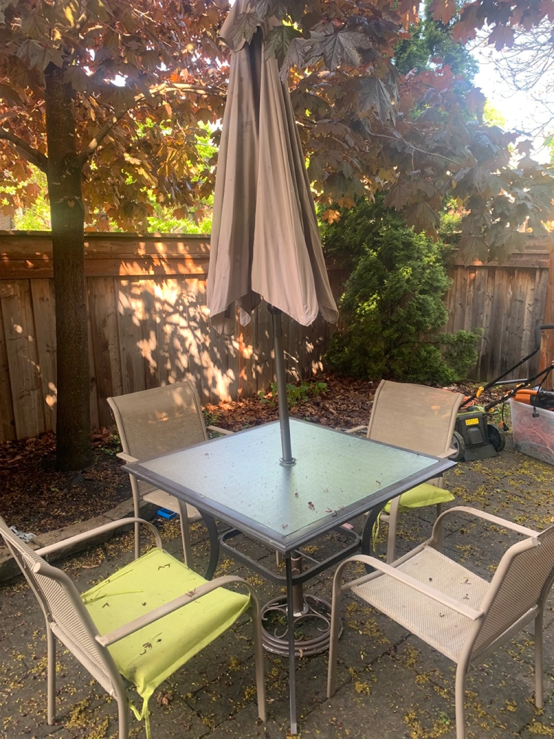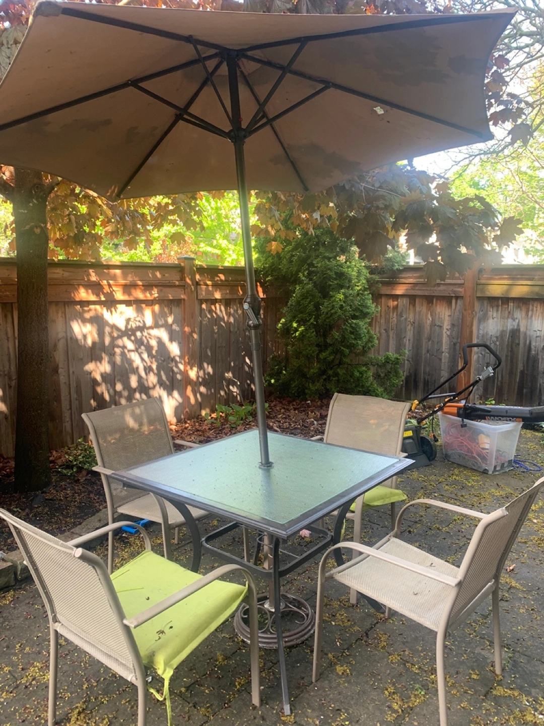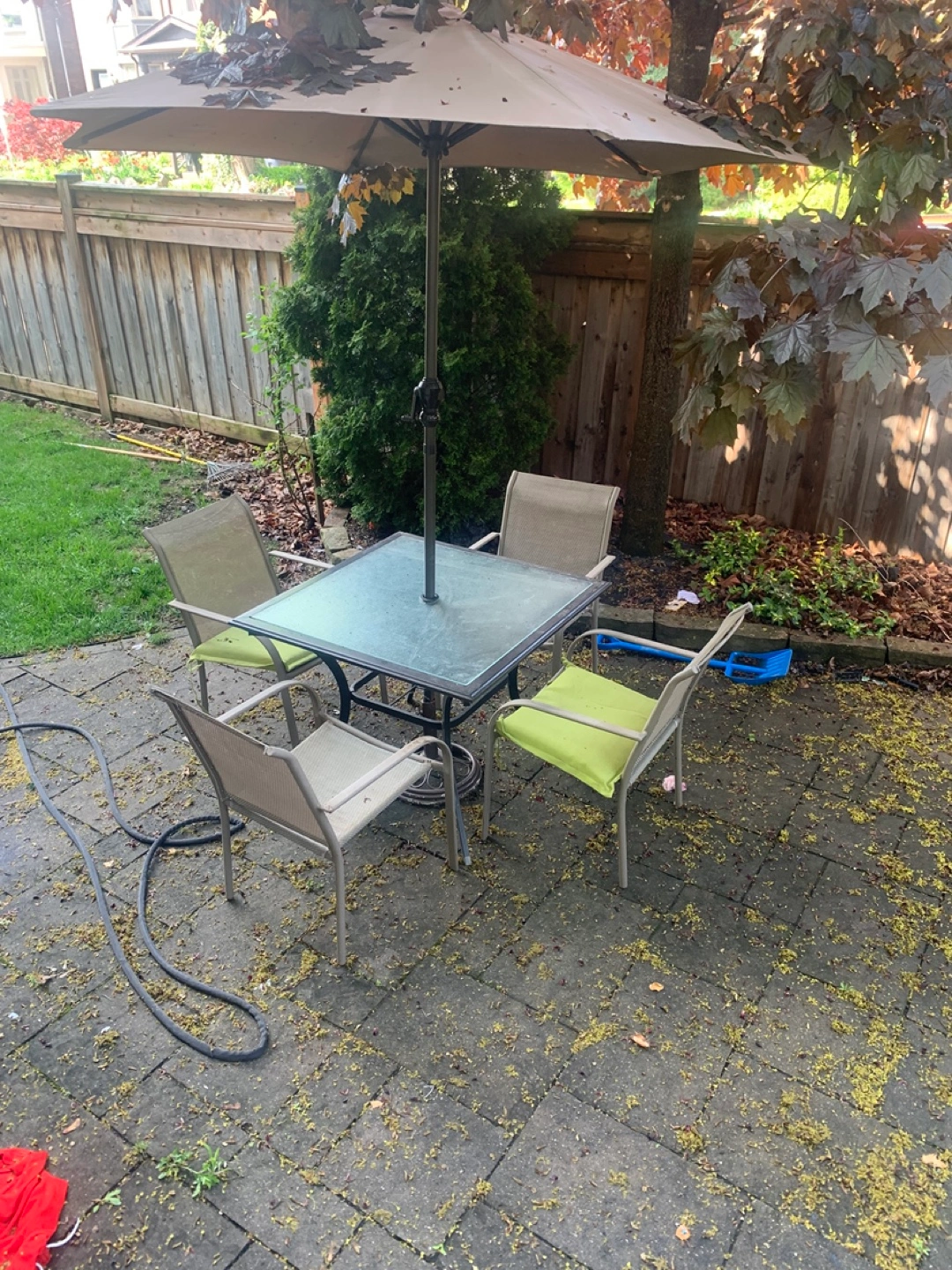 Four-piece patio furniture set. Includes square glass-top table and four metal chairs. Umbrella included. Shows some wear. Needs a good clean some pain spots will come off with a pressure washer.