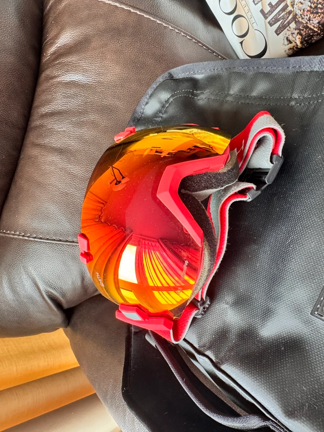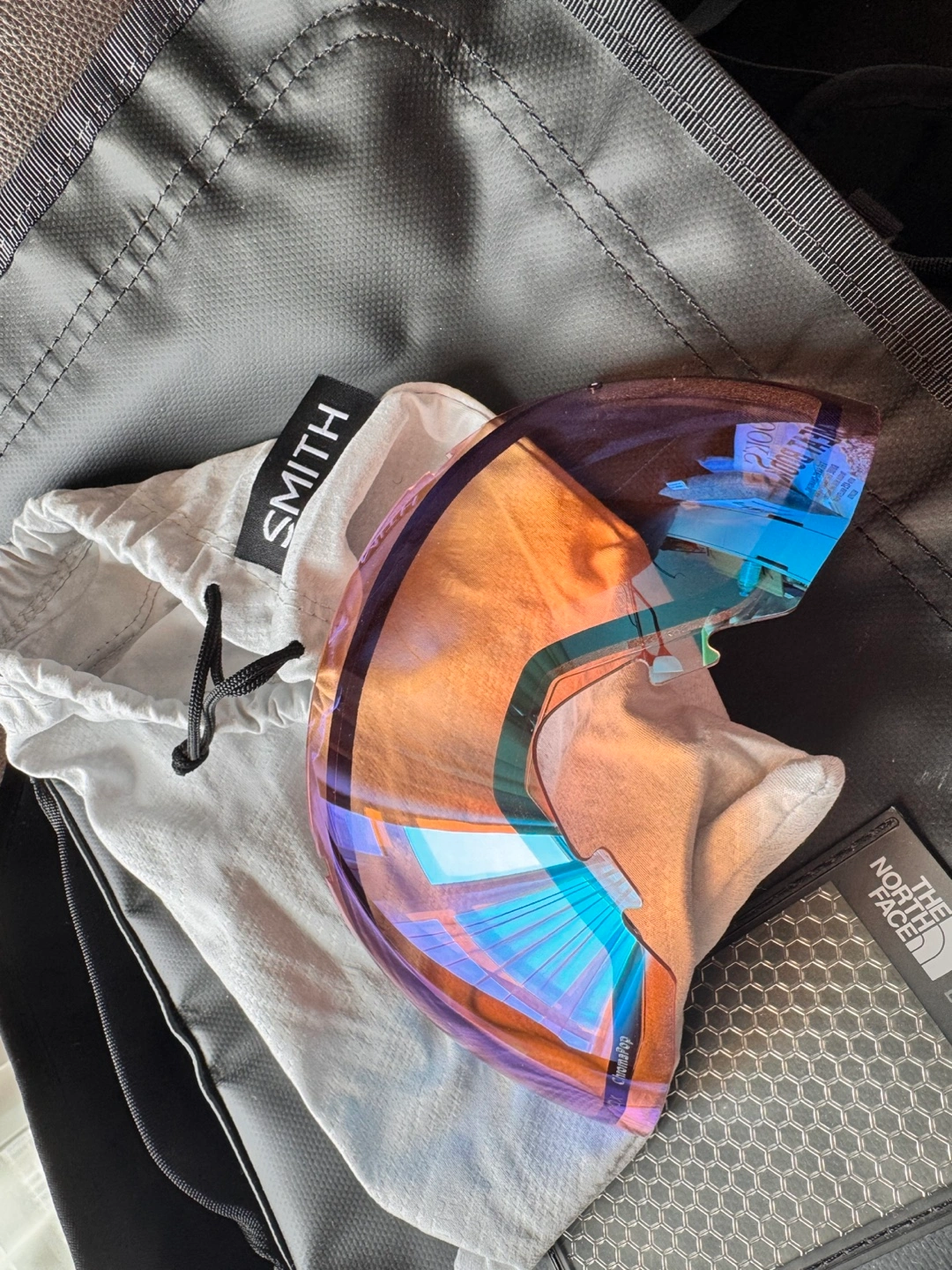 Pair of Smith Optics snow goggles. Red frame with spare lens. Great for snowboarding or skiing. Includes microfiber bag.