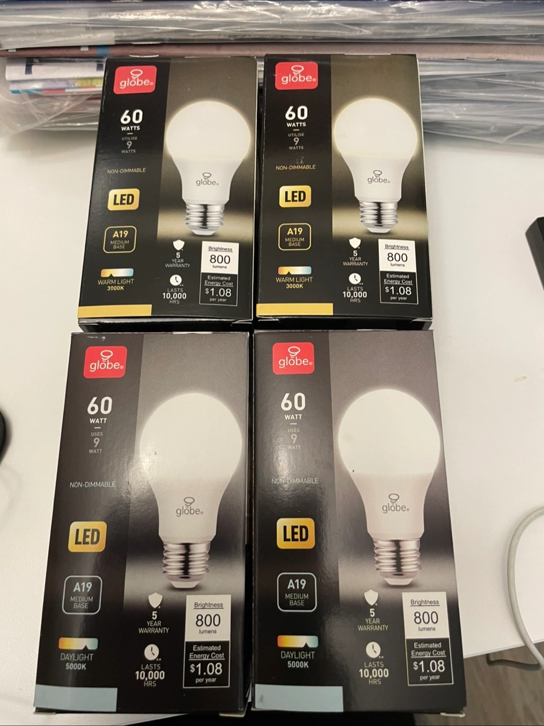 Package of four Globe Electric LED light bulbs. A19 medium base. 60-watt equivalent, uses 9 watts. Non-dimmable. Warm light (3000K) and daylight (5000K) options available. 800 lumens. Lasts 10,000 hours. Estimated energy cost $1.08 per year.