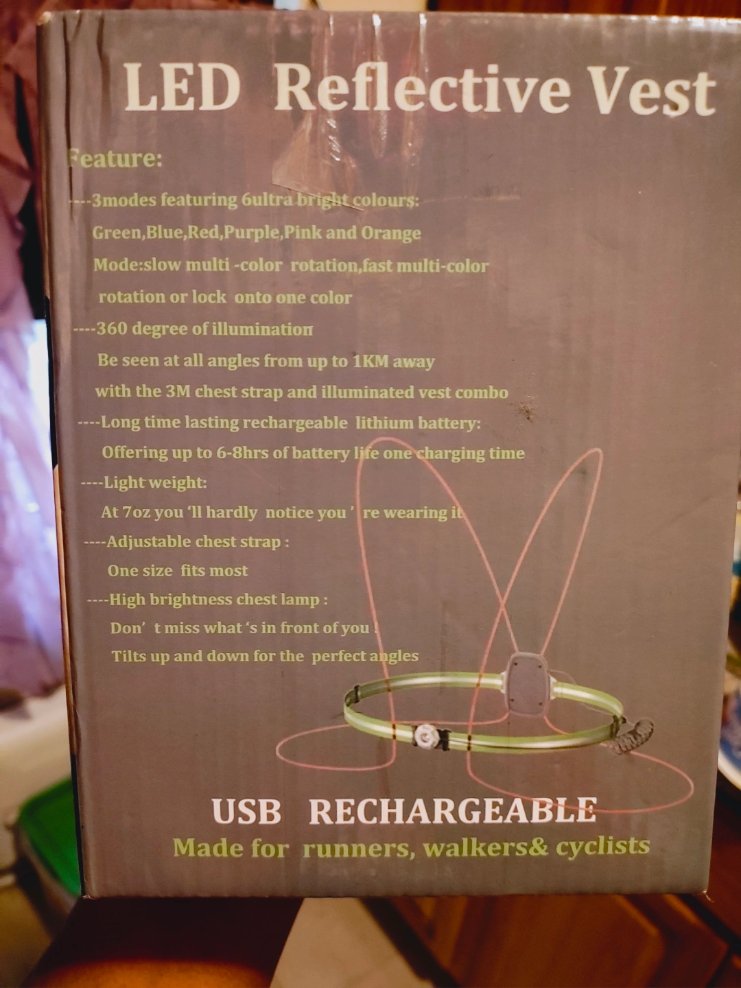 LED REFLECTIVE VEST USB rechargeable. 360-degree illumination. Up to 6-8 hours of battery life per charge. One size fits most. Light weight. Adjustable strap. Multiple color modes.