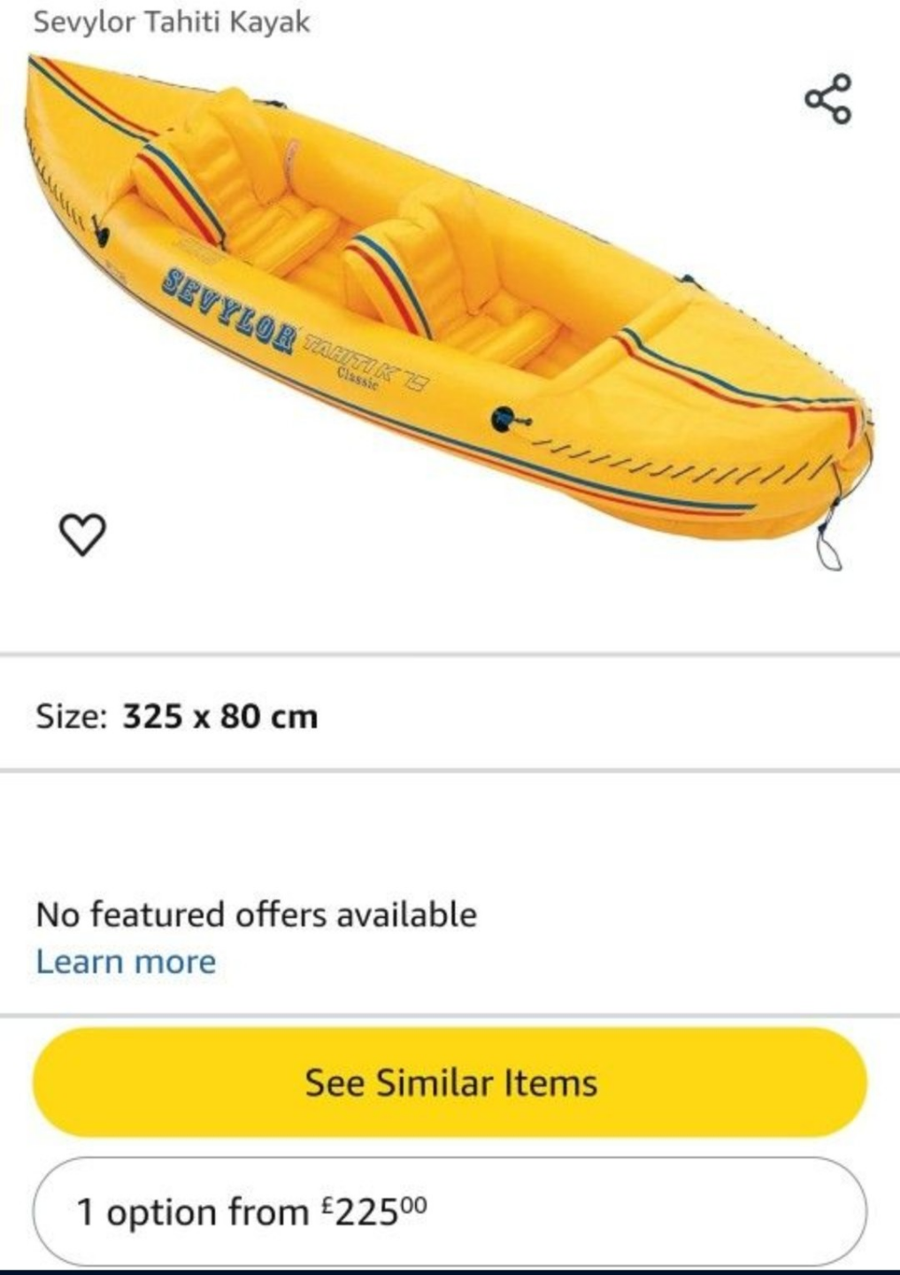 1 / 31 / 3Buy & SellSevylor Tahiti Kayak - Inflatable 2-Person KayakSevylor Tahiti Kayak - Inflatable 2-Person Kayak$100Yellow inflatable kayak. Two-person capacity. Classic model. 325 x 80 cm. OBOWHERE TO MEETCheck LocationView MapSELLERYessySouth Lawndale181 review1 chats·1 favorites·32 viewsSEND CHAT TO SELLERHi Yessy! I’m interested in your listing.Hi Yessy! I’m interested in your listing.Get the Karrot app to chatSign In to chat