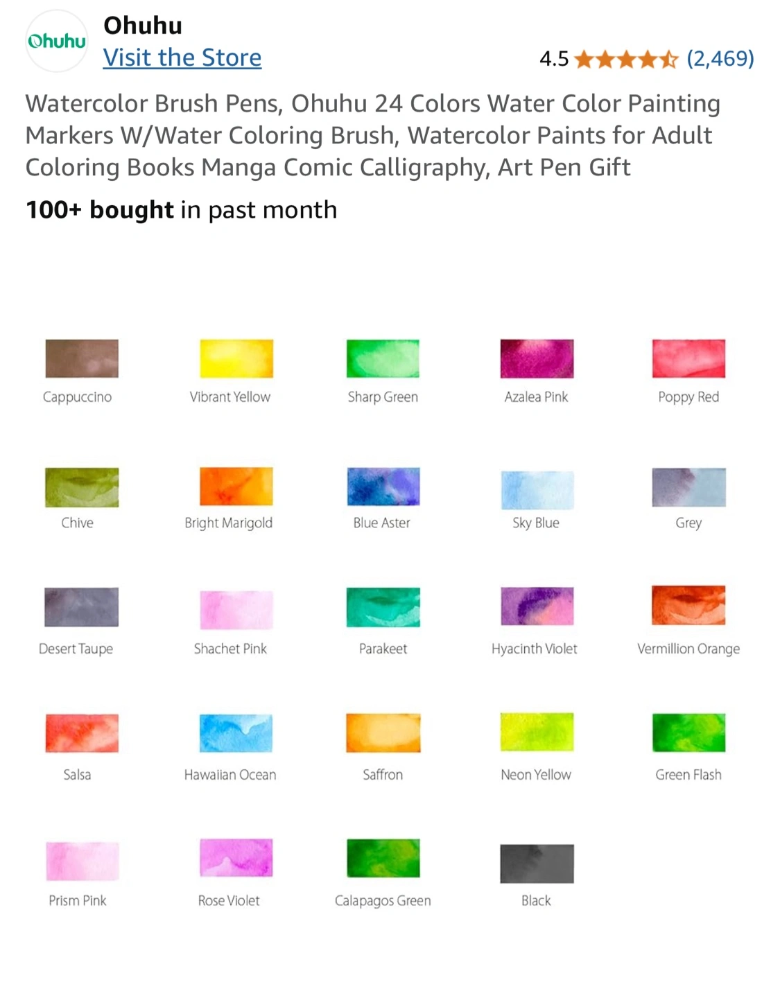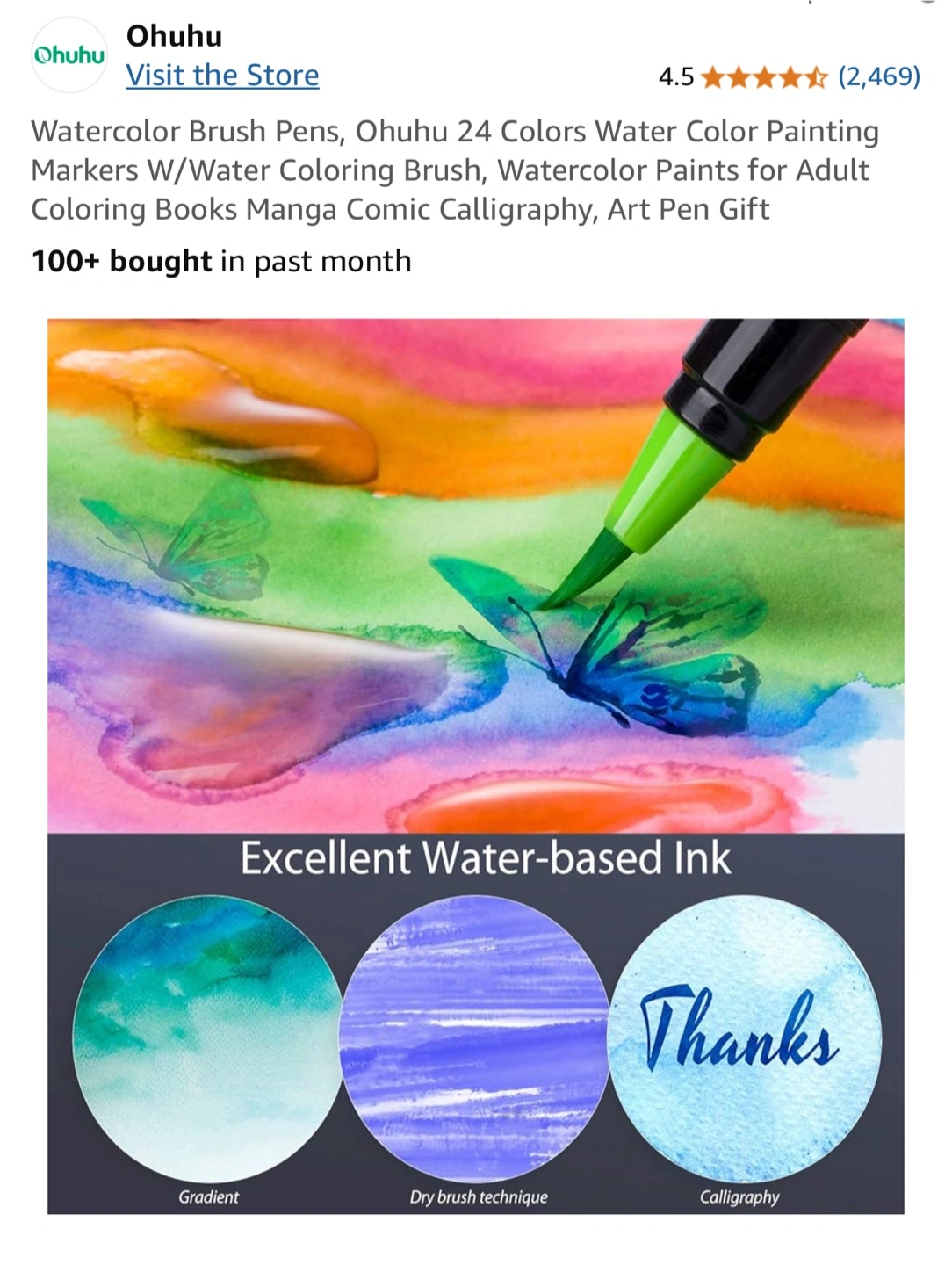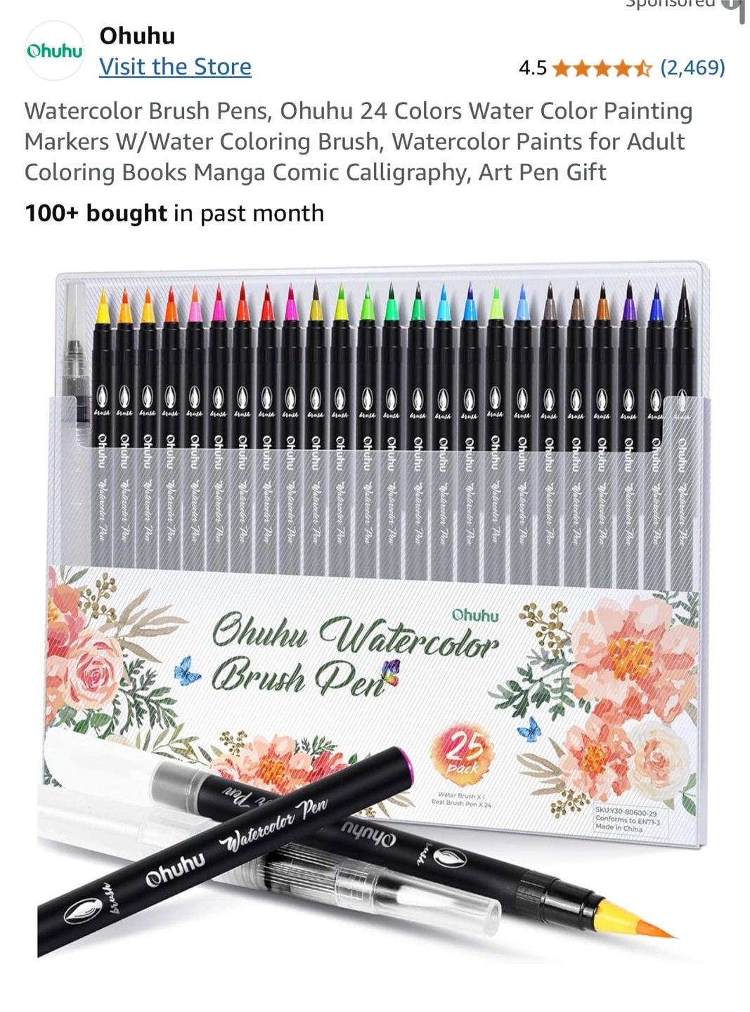 25 vibrant colours. Flexible brush tip. Ideal for watercolour painting, drawing, colouring, and calligraphy. Water-based ink. Great for adult colouring books and manga comic art.