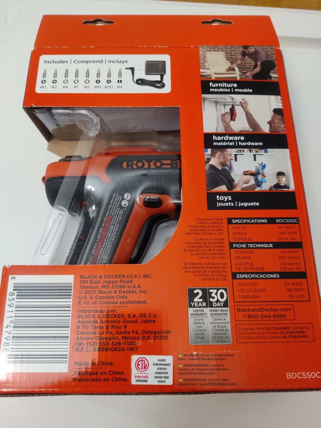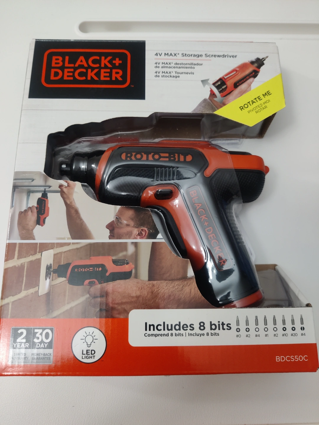 Cordless screwdriver, compact design. Includes 8 bits. LED light. 2-year warranty. Variable speed. Easy bit storage. BLACK+DECKER 4V MAX Cordless Screwdriver with Bit Storage (BDCS50C). cash, pickup only.