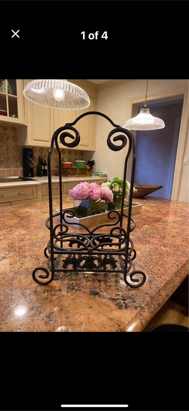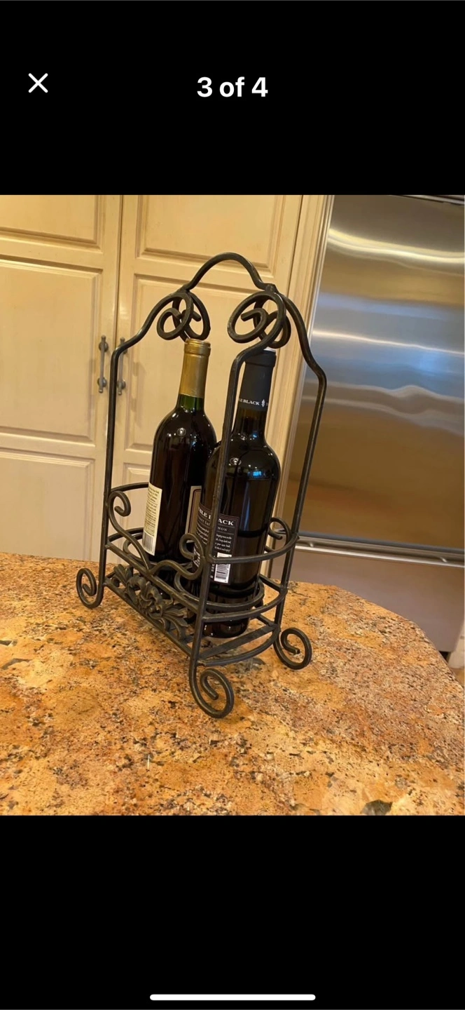 65Black metal wine rack. Holds two bottles. Ornate design. Perfect for countertop display.