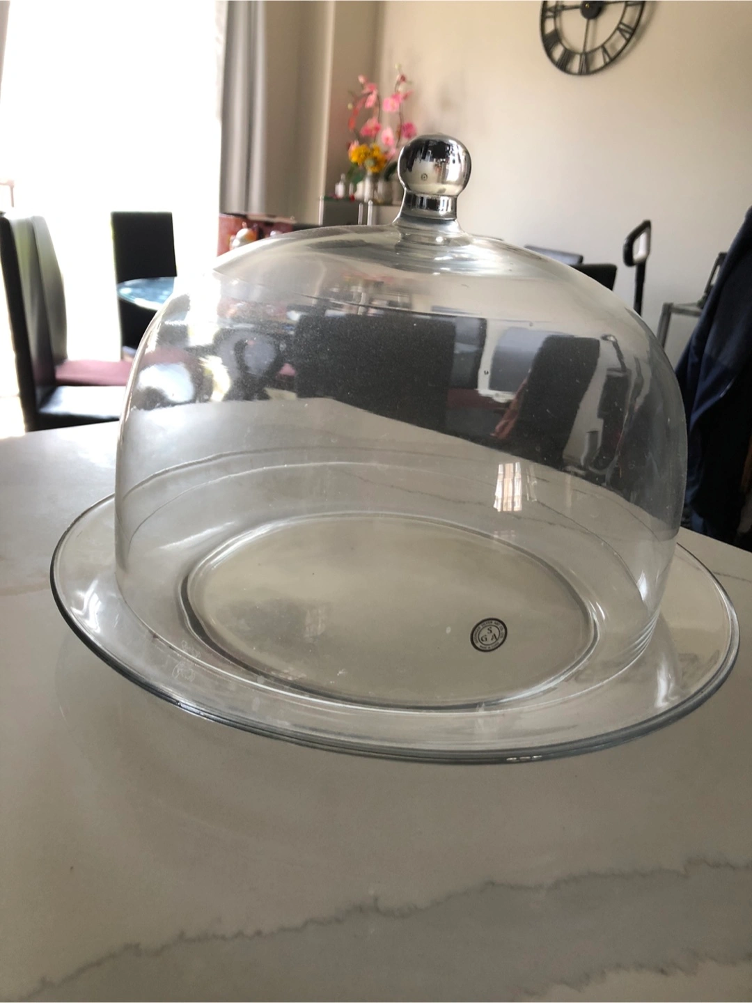 Clear glass cake dome with glass plate. Perfect for displaying baked goods or desserts. Elegant design.