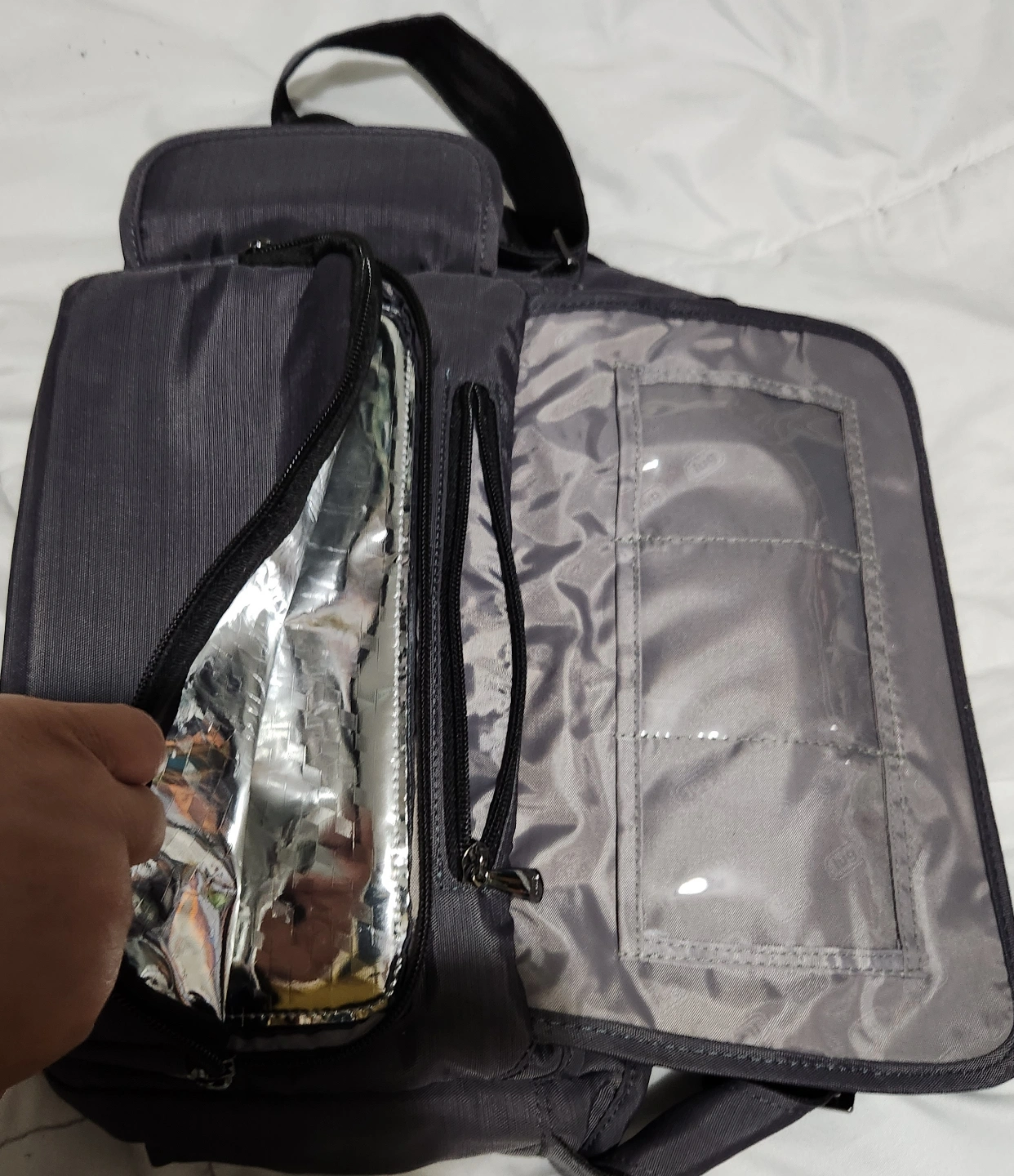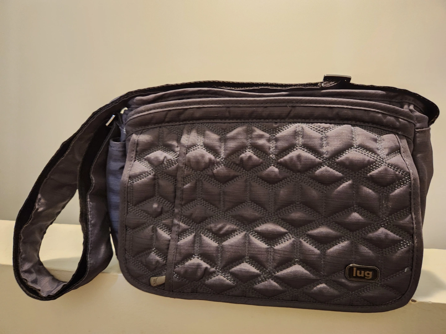 Grey quilted crossbody bag. Multiple compartments and pockets. Adjustable shoulder strap. Features an insulated pocket. Perfect as a travelling or everyday bag.