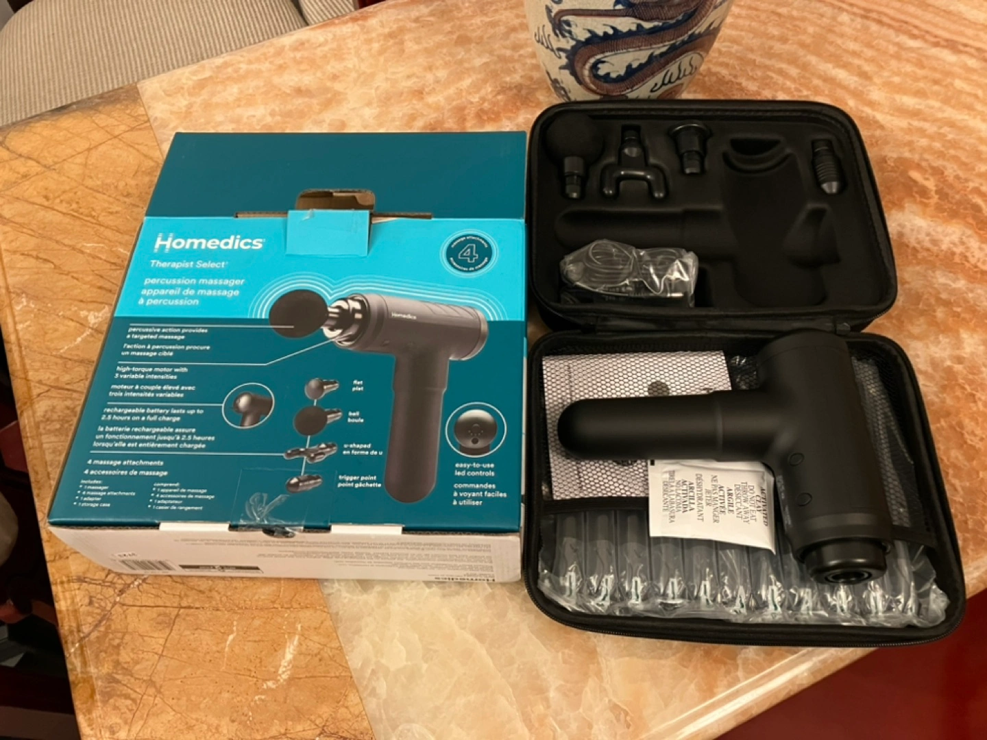 New percussion massager with multiple attachments. Rechargeable battery. Easy-to-use LED controls. Includes carrying case.