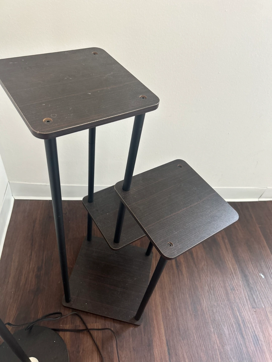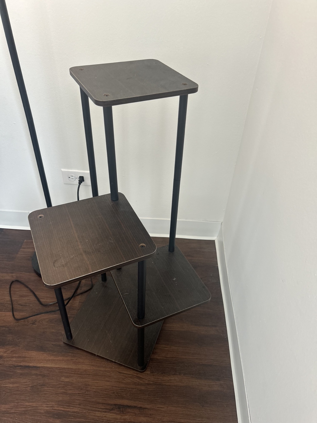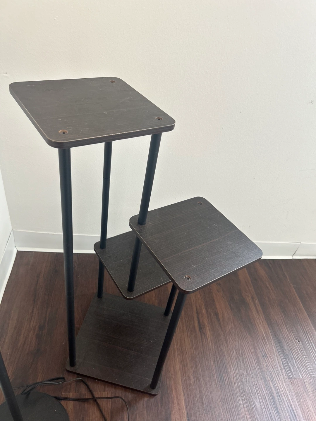 Dark brown wood and black metal plant stand. Three square shelves. Perfect for plants, flowers, or decorative items.