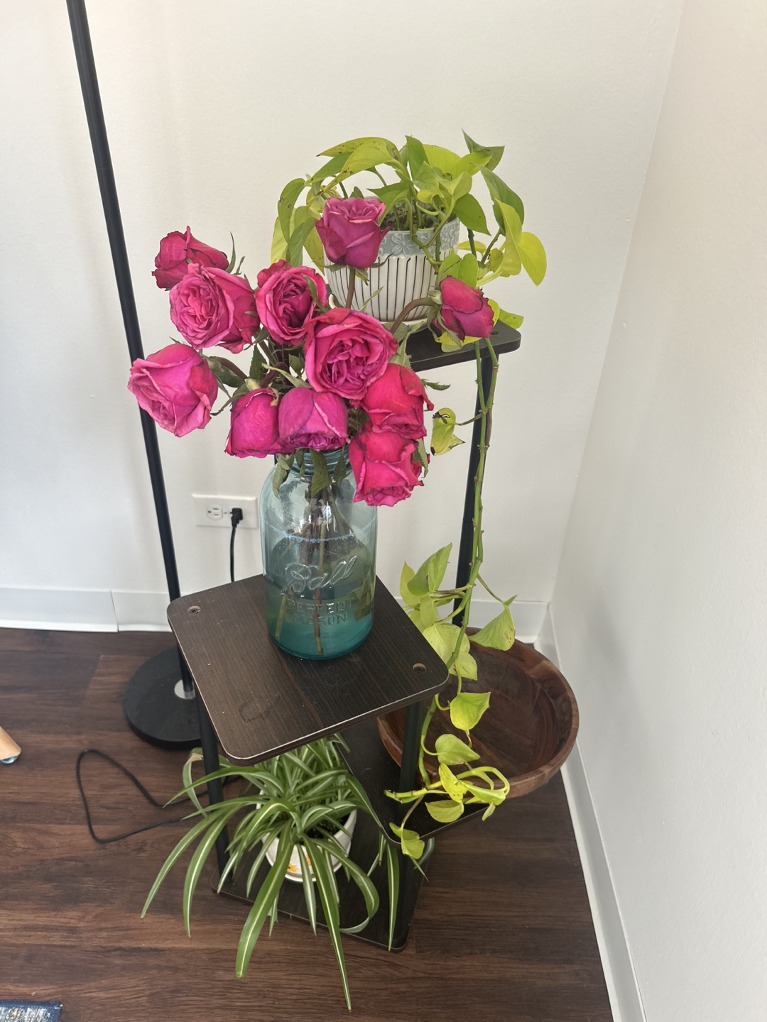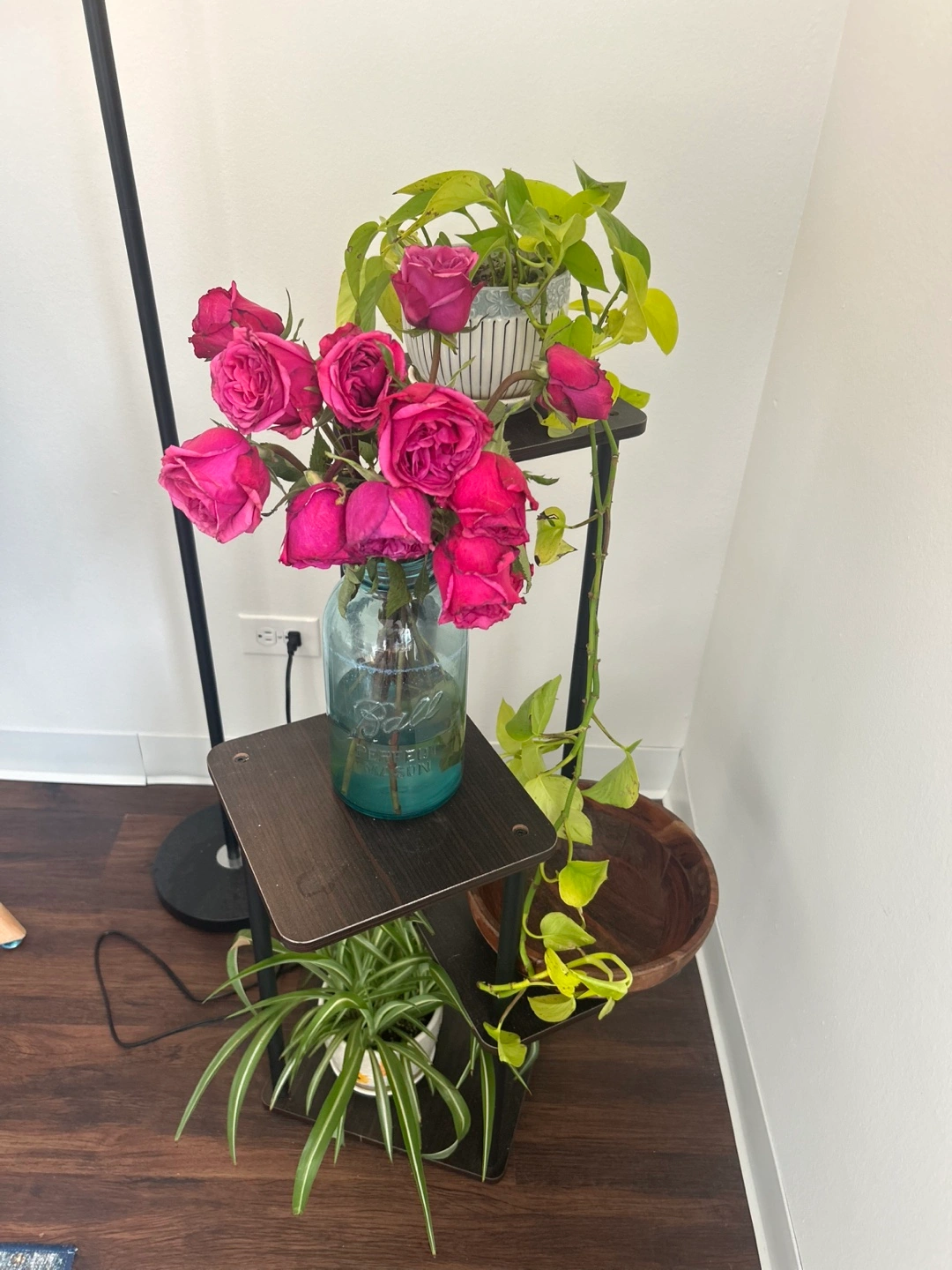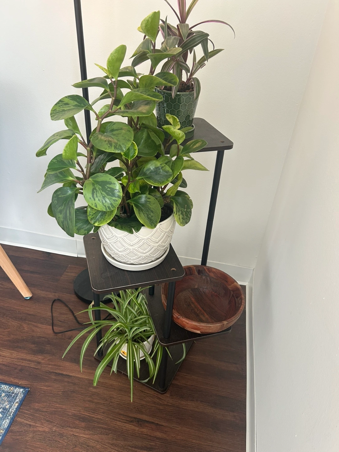 Dark brown wood and black metal plant stand. Three square shelves. Perfect for plants, flowers, or decorative items.