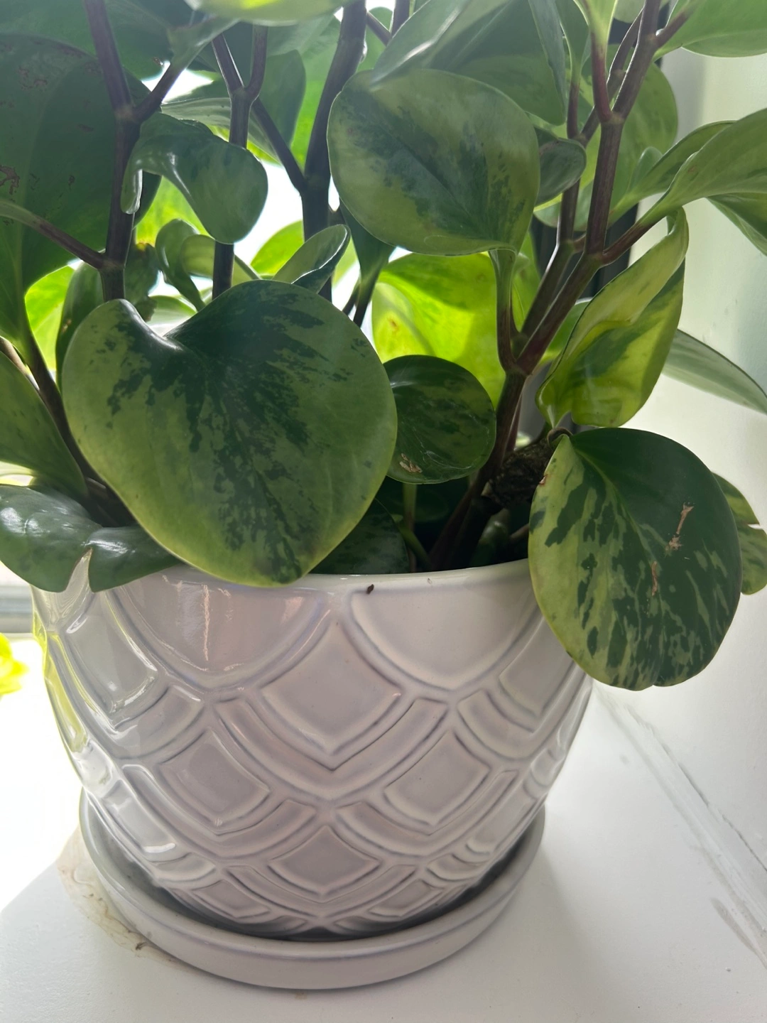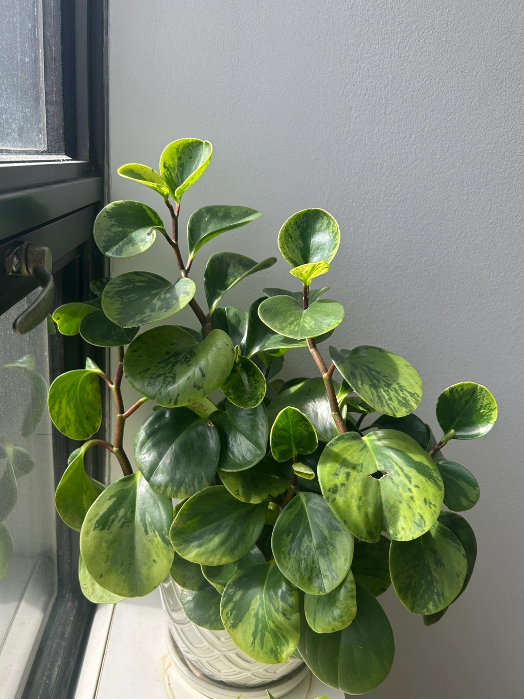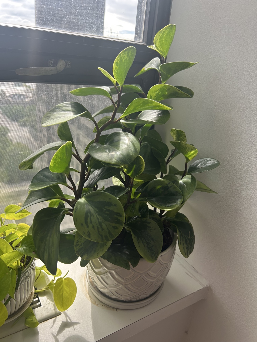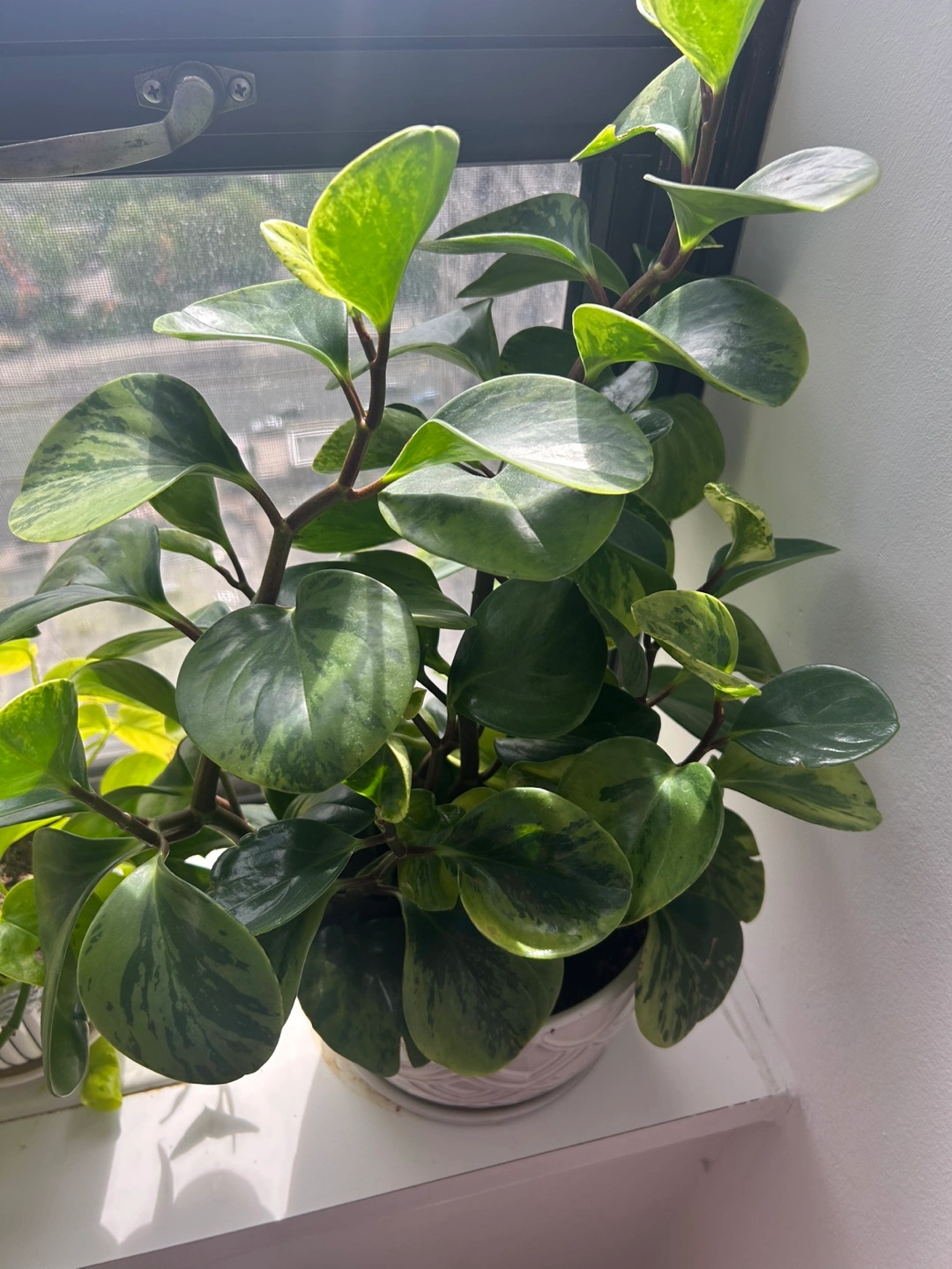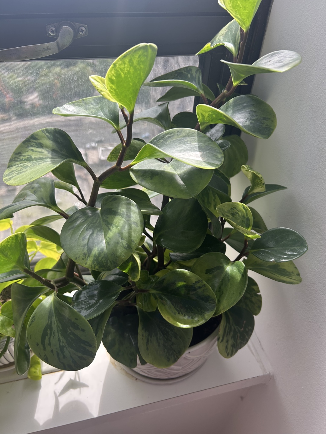 Healthy Peperomia obtusifolia 'Marble' in a white ceramic pot. Cat and dog friendly! Features variegated leaves. Great addition to any home. Great size and easy to maintain! Needs just a little sunlight!