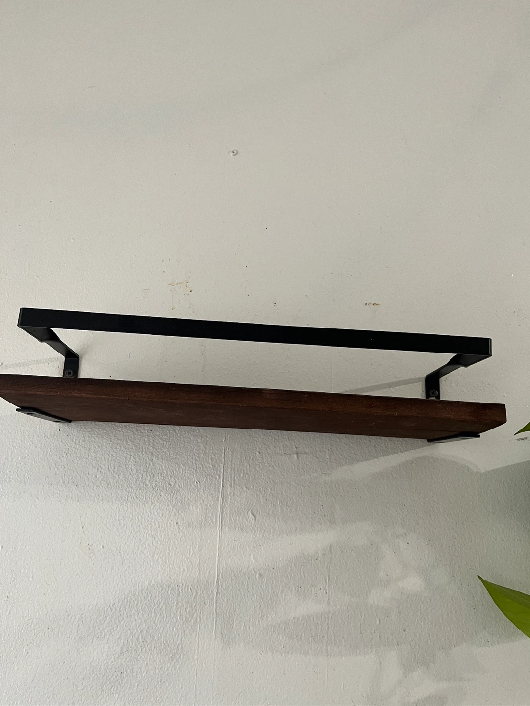 Stylish dark wood floating shelf. Black metal brackets for a modern look. Perfect for small spaces. Easy to install.