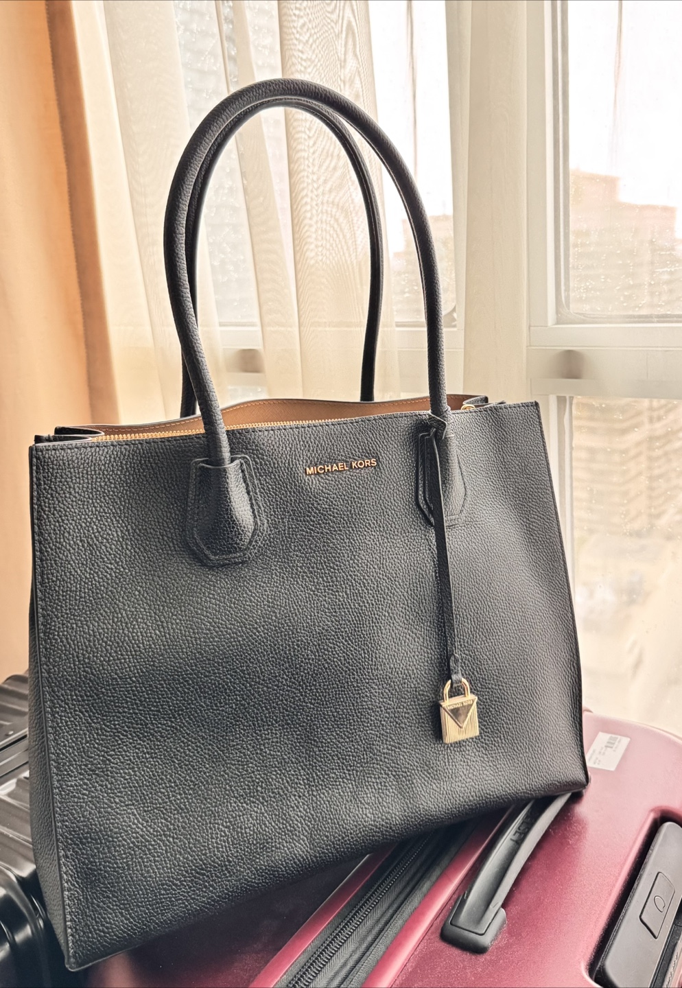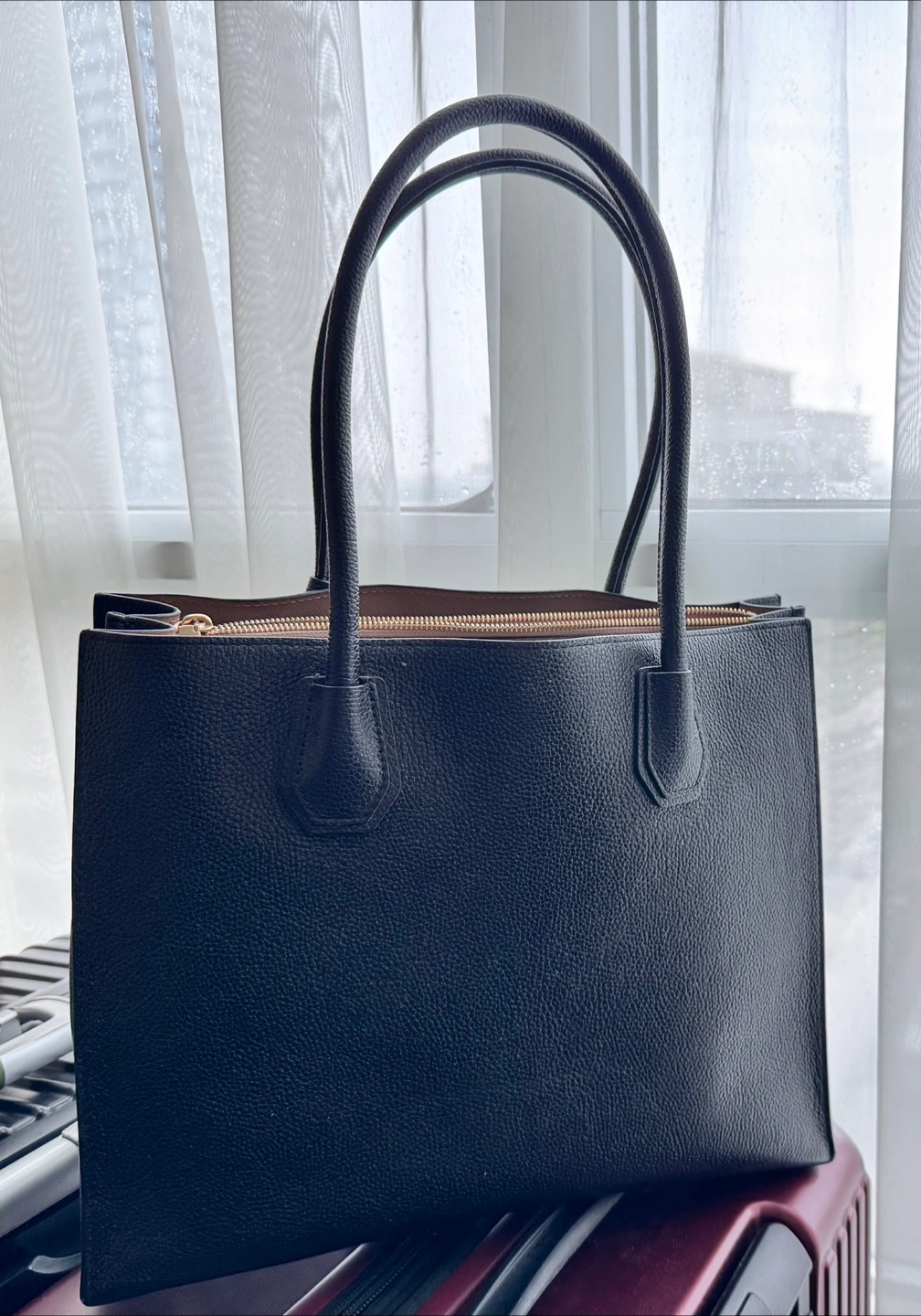 Large black tote bag. Top zip closure. Gold hardware. Pebbled leather. Big enough for laptops. Great for travel or everyday use.