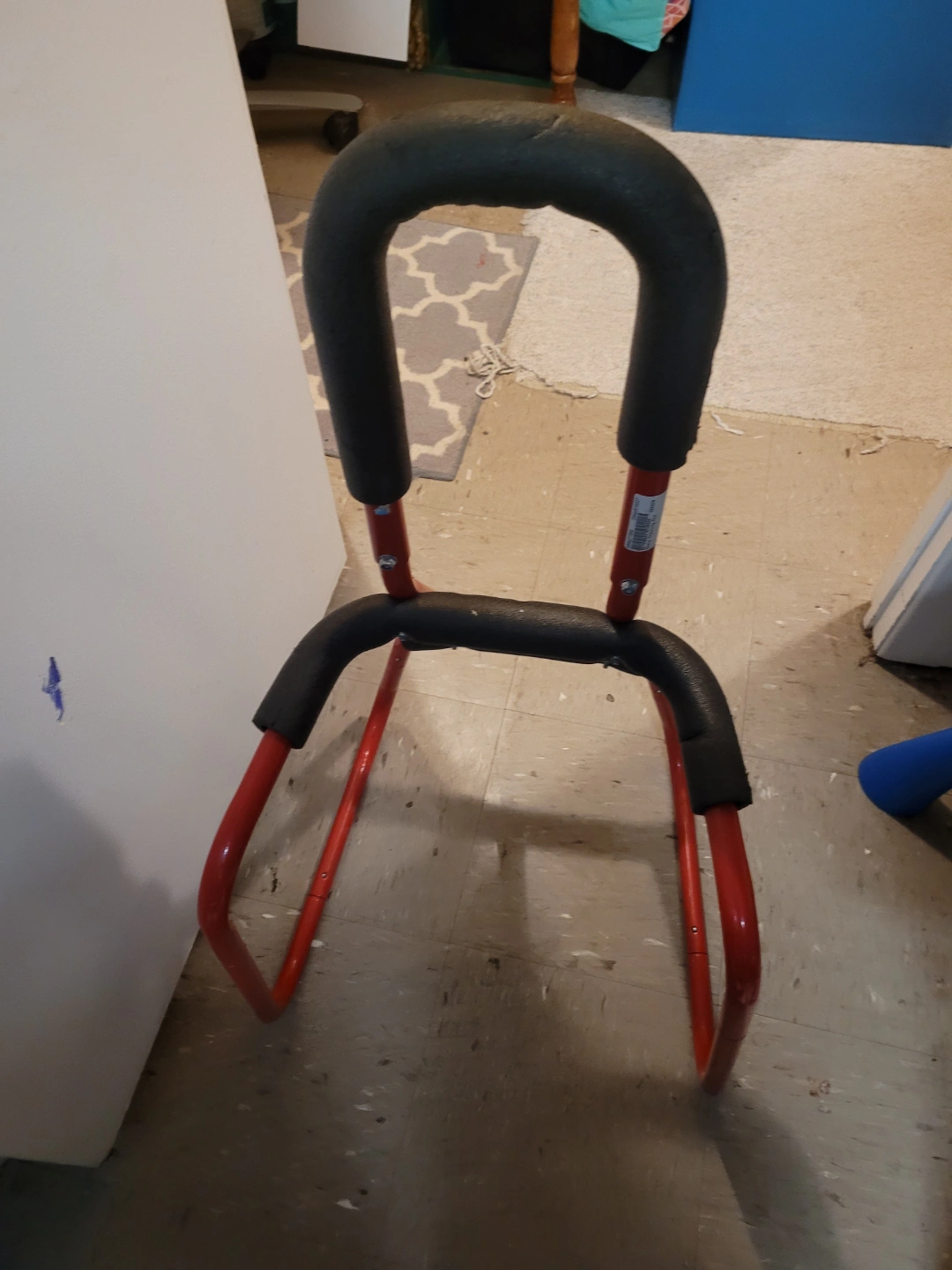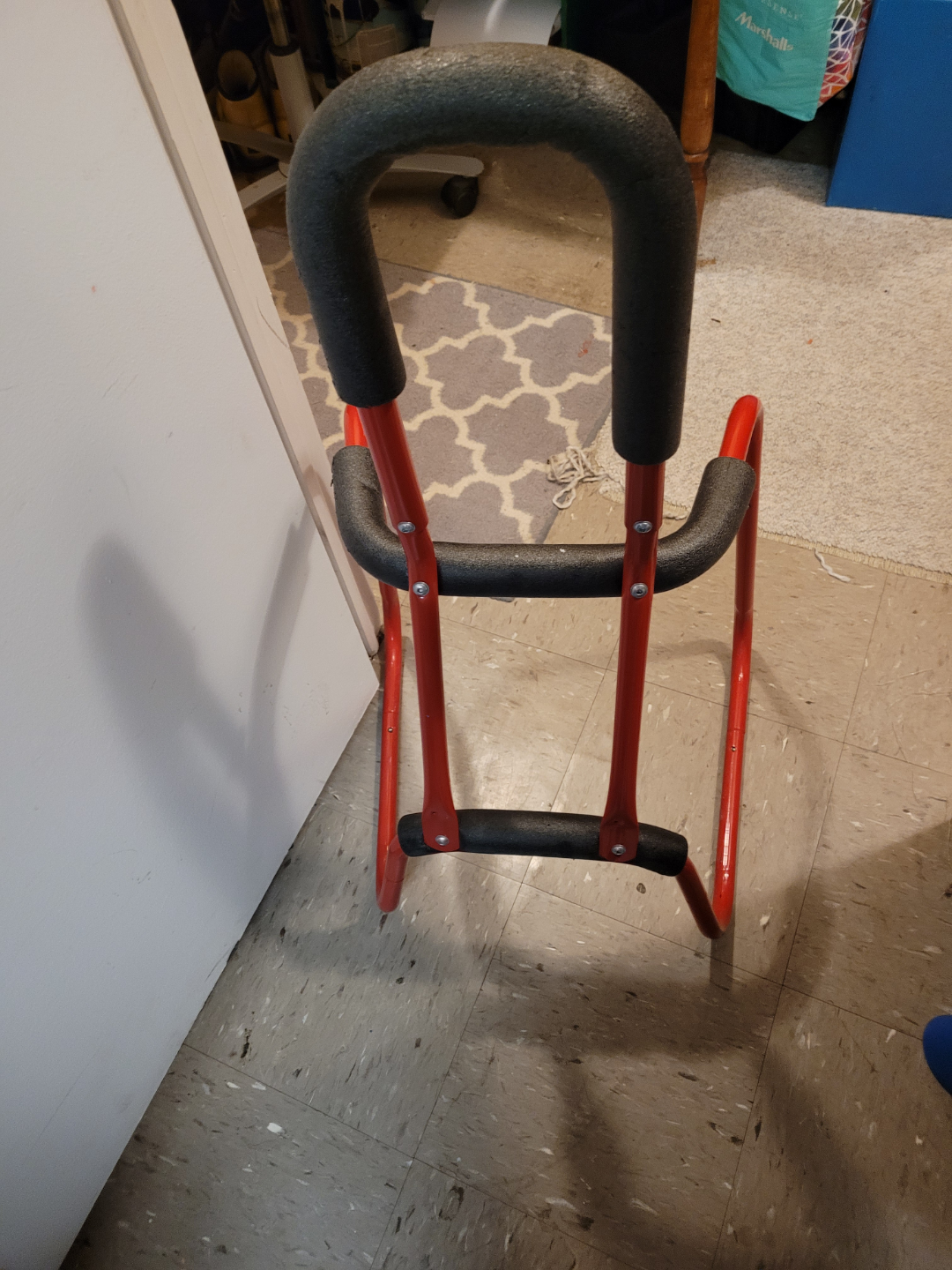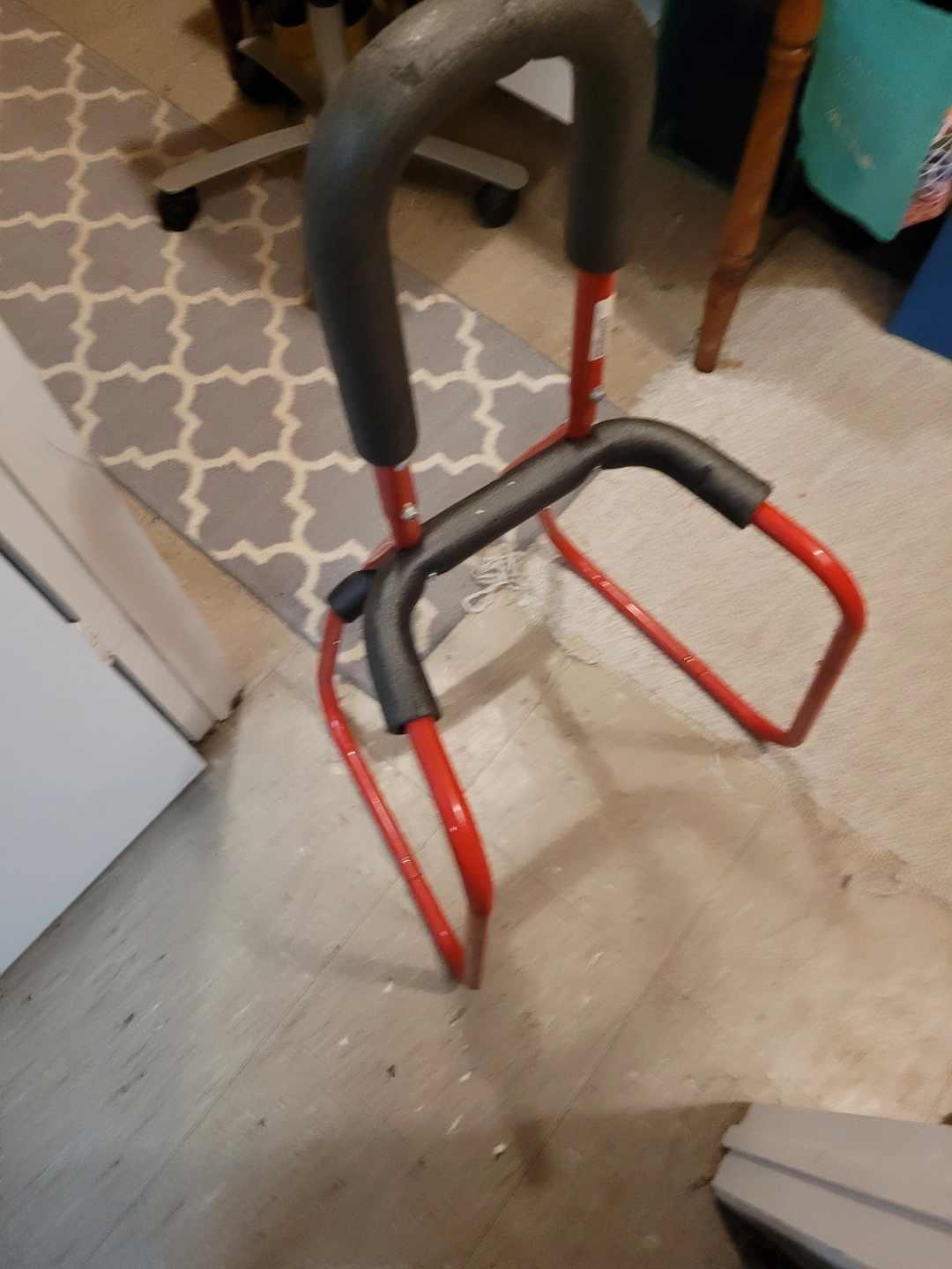 Portable stand-up assist device. Red metal frame with black foam padding. Good for seniors or those with mobility issues. Lightweight and easy to store.
