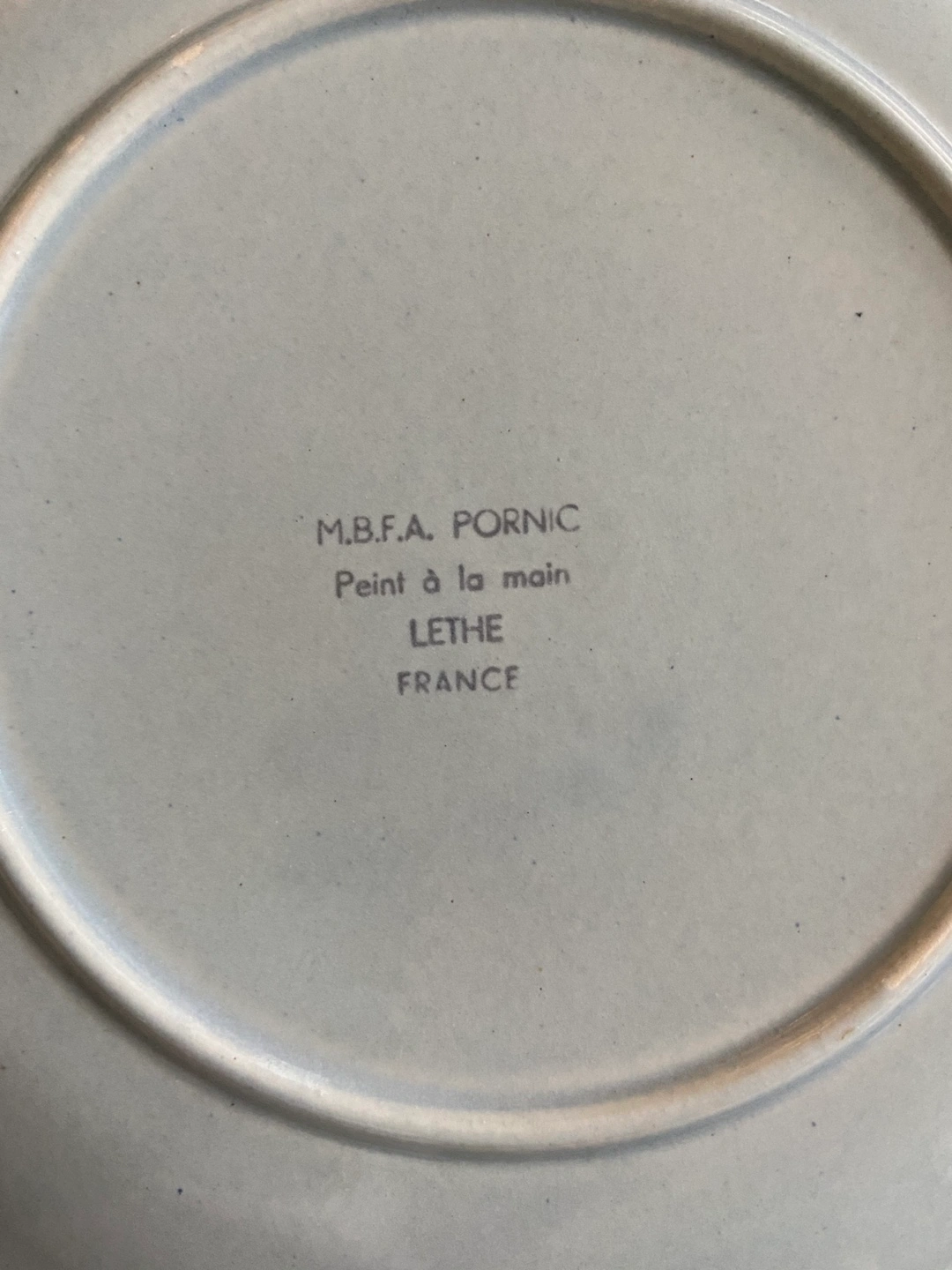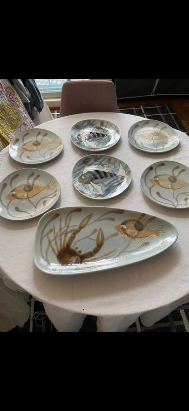 MBFA Pornic Fish Service "Thalassa" c 1960 Unique set of six plates and one platter. Ocean theme. Hand-painted fish and crab designs. Oval platter included. Plates are round. Excellent for serving or display.