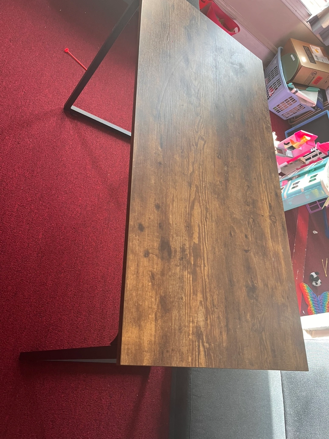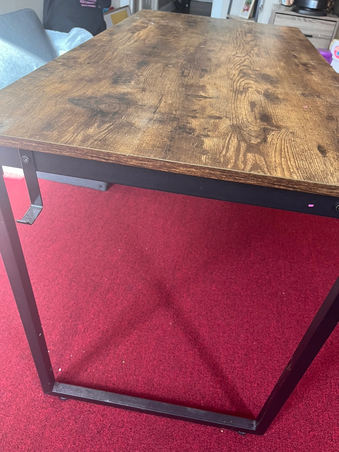 Simple writing desk. Brown wood-look top. Black metal legs. Good for small spaces. Some minor wear.