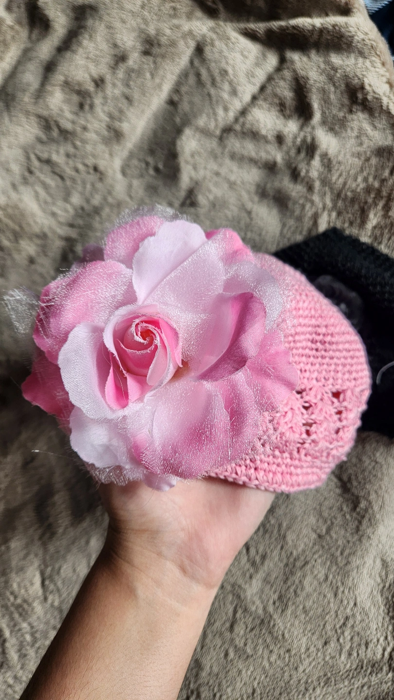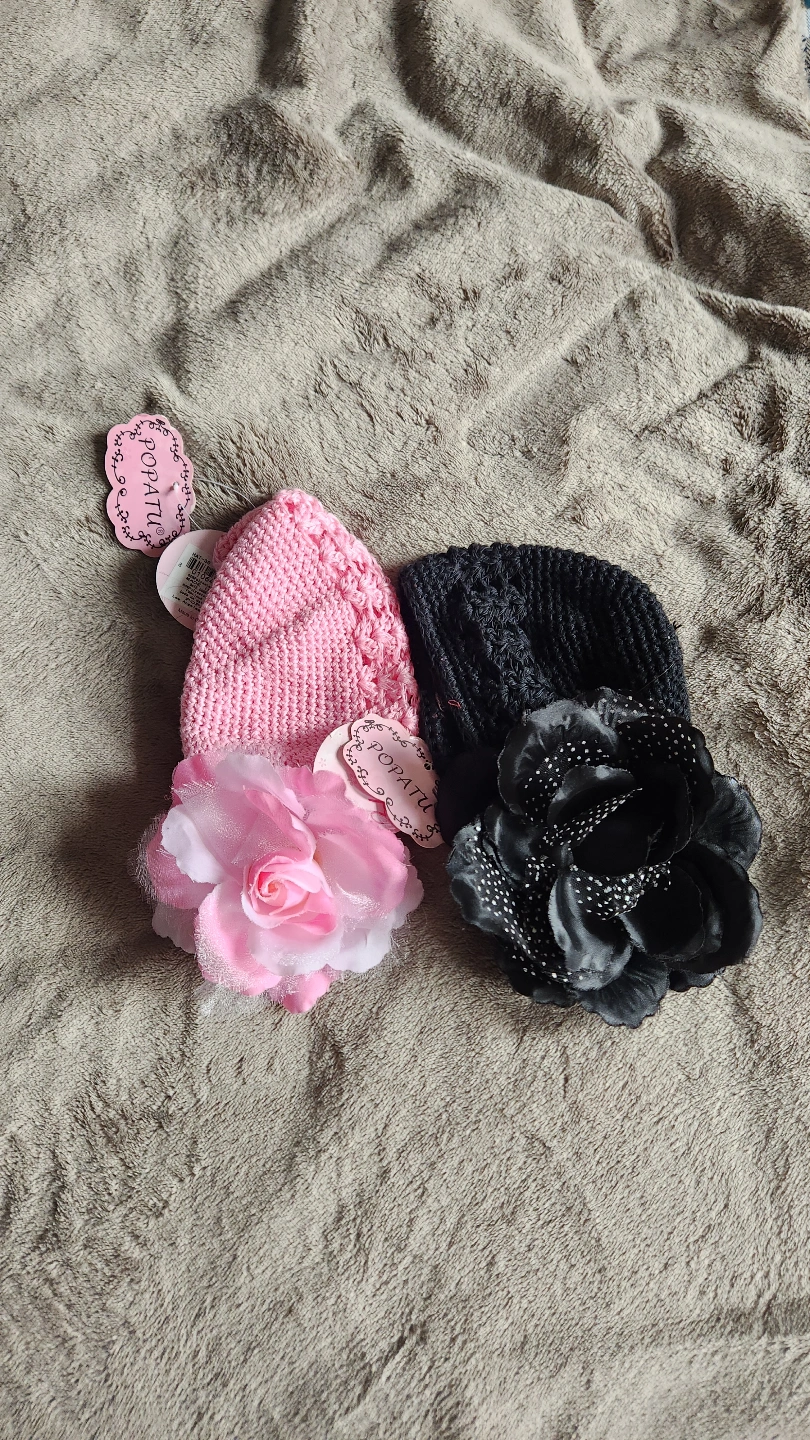Adorable set includes one pink and one black crocheted baby hat. Each features a unique fabric flower embellishment. New with tags. Perfect for newborn photos or a special occasion. TAKE BOTH ♡