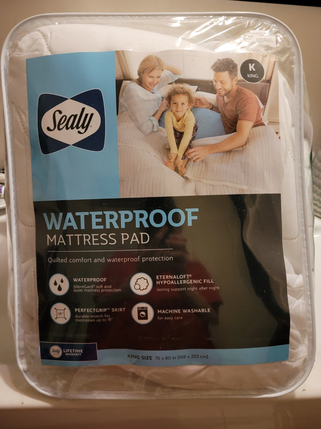 King size Sealy waterproof mattress pad. Machine washable. Features hypoallergenic fill and a fitted skirt. Offers quiet mattress protection with a Sealy lifetime warranty.