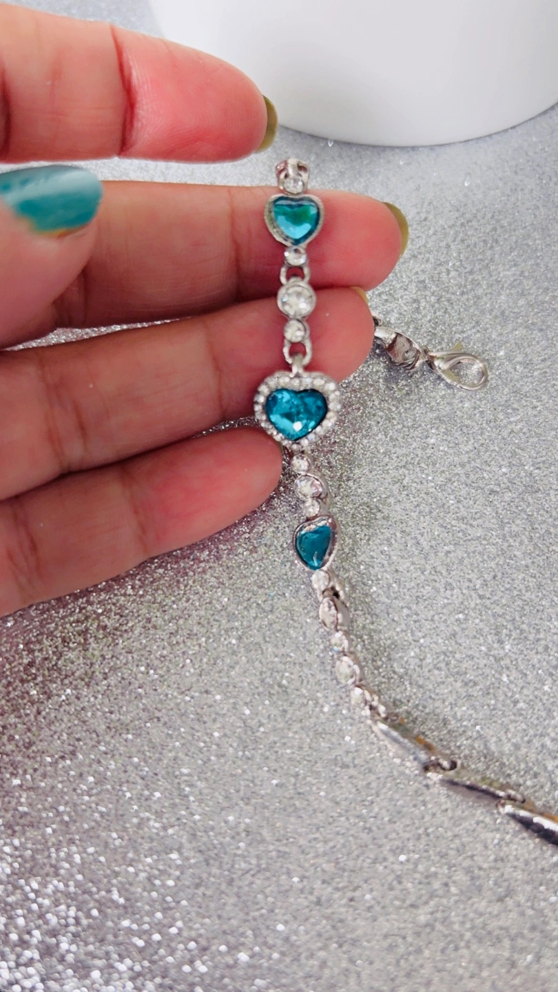 Beautiful bracelet featuring three teal heart-shaped crystals and clear accents. Silver-toned chain. Lobster clasp closure.