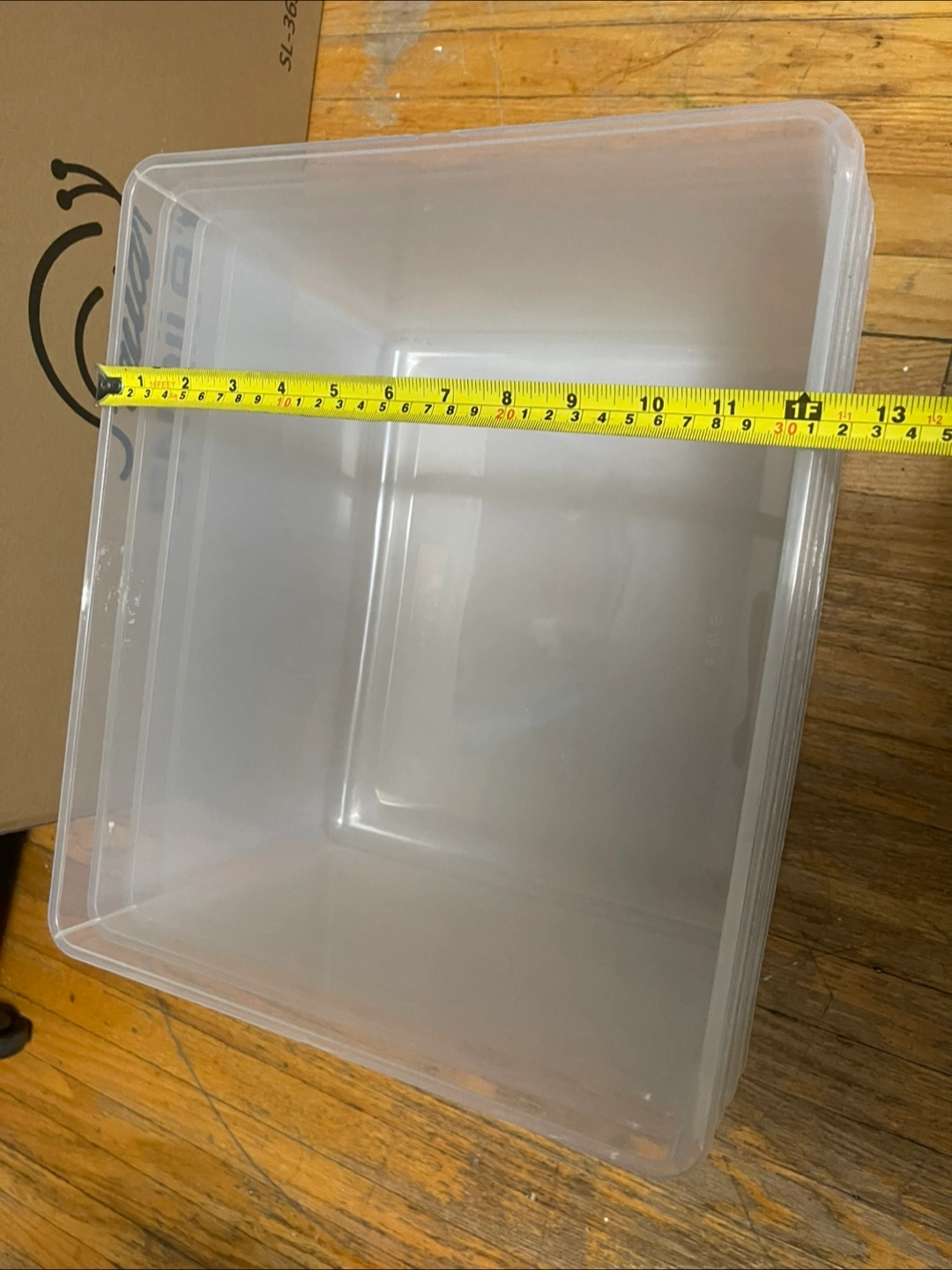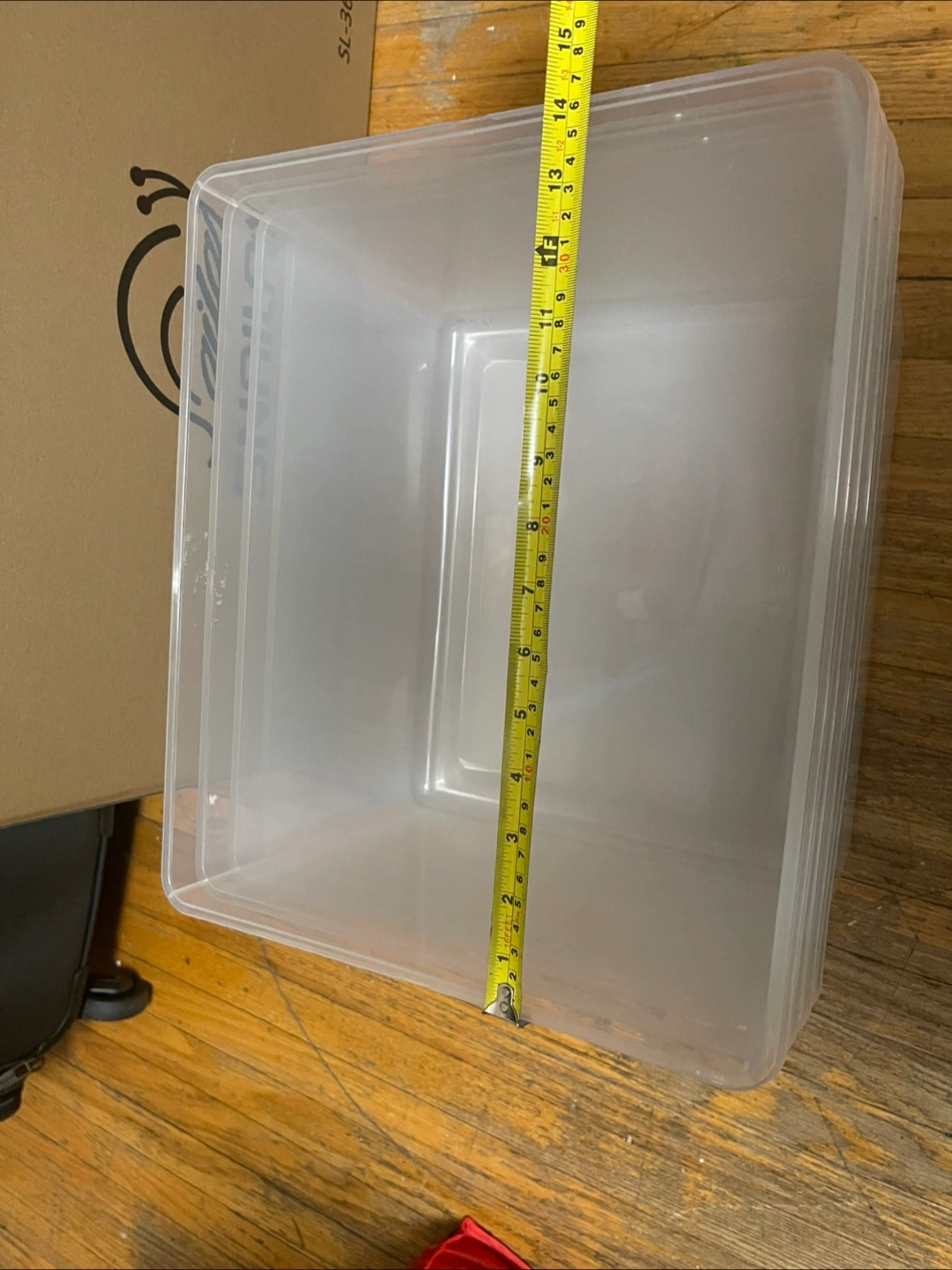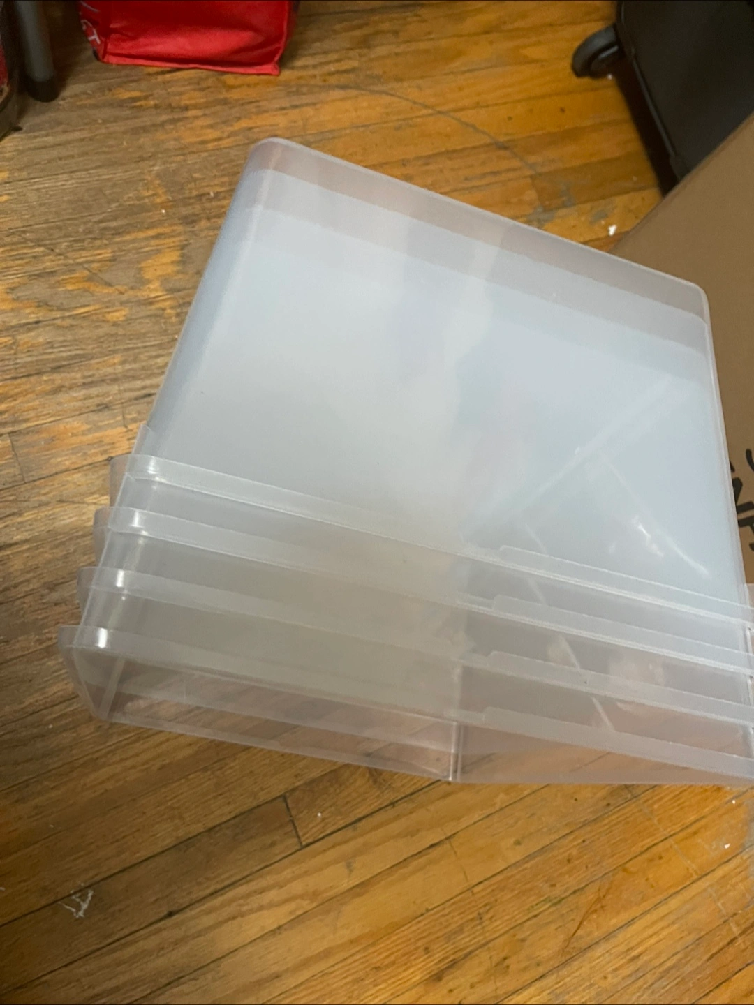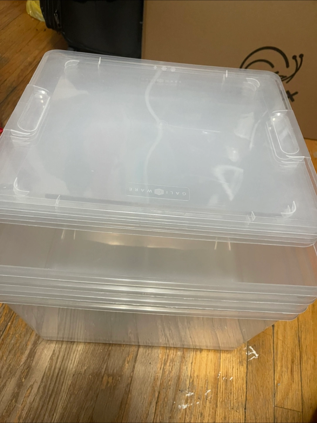 Six stackable clear plastic storage containers. Great for organizing closets or shelves. Each bin comes with a clear lid.