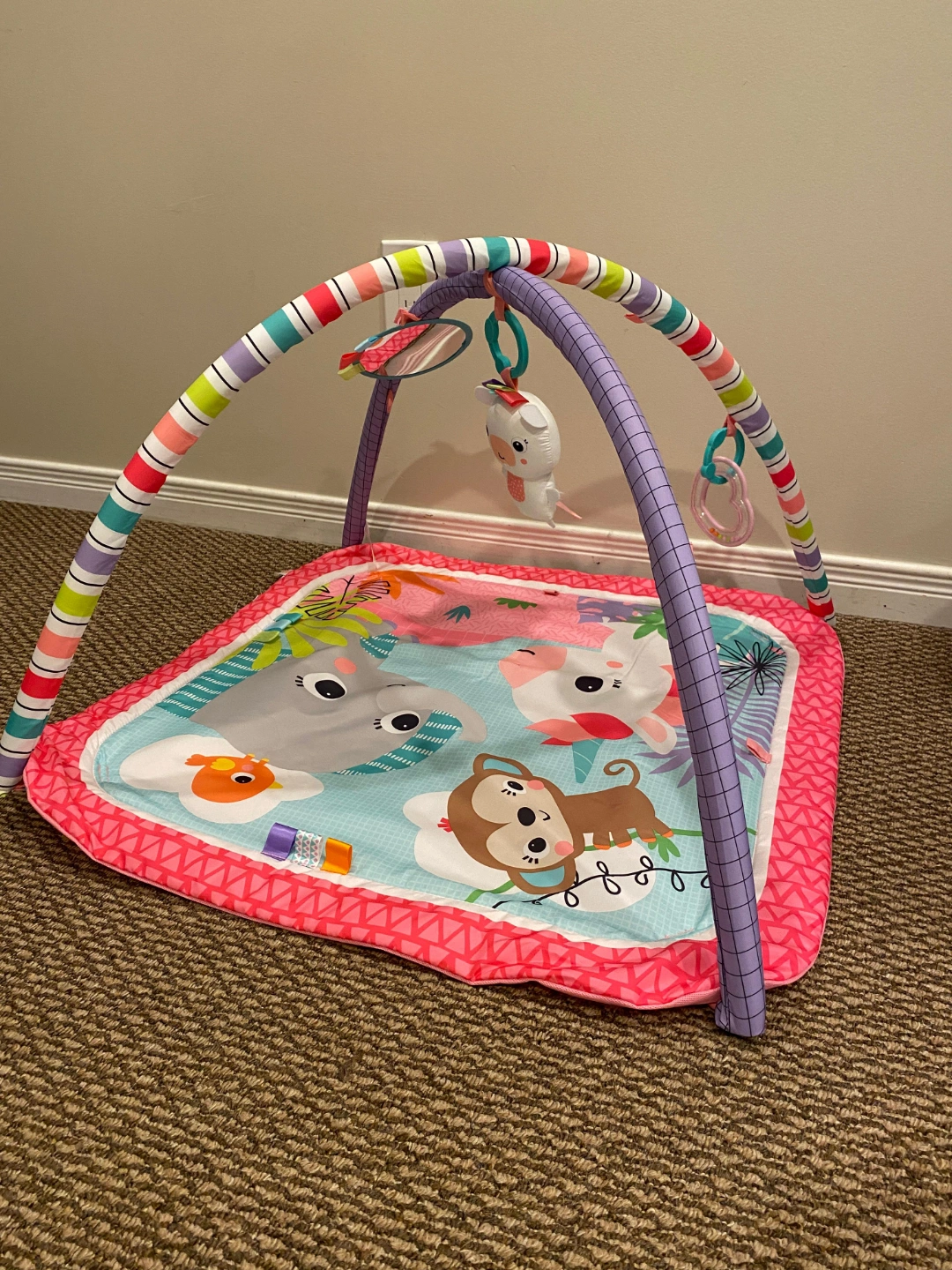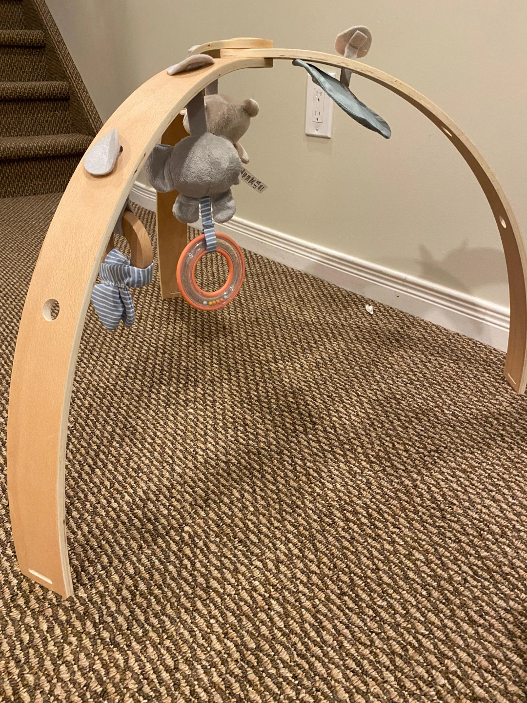 Two baby playmats for sale. One colourful mat with arch and hanging toys. Other mat features a wooden arch with hanging toys. Great for playtime and development.