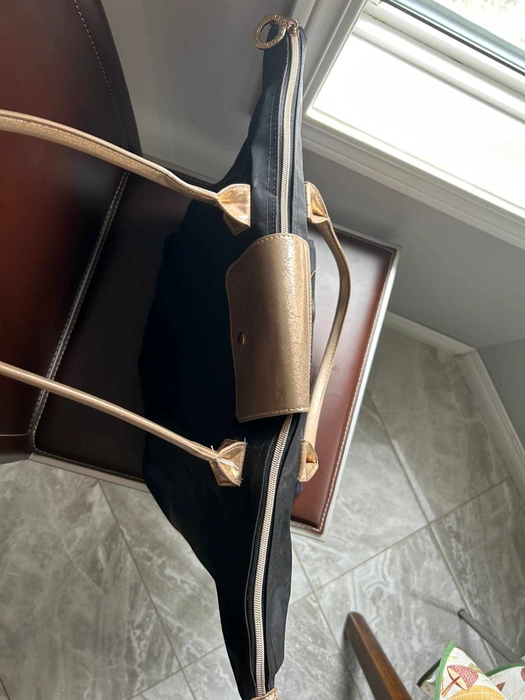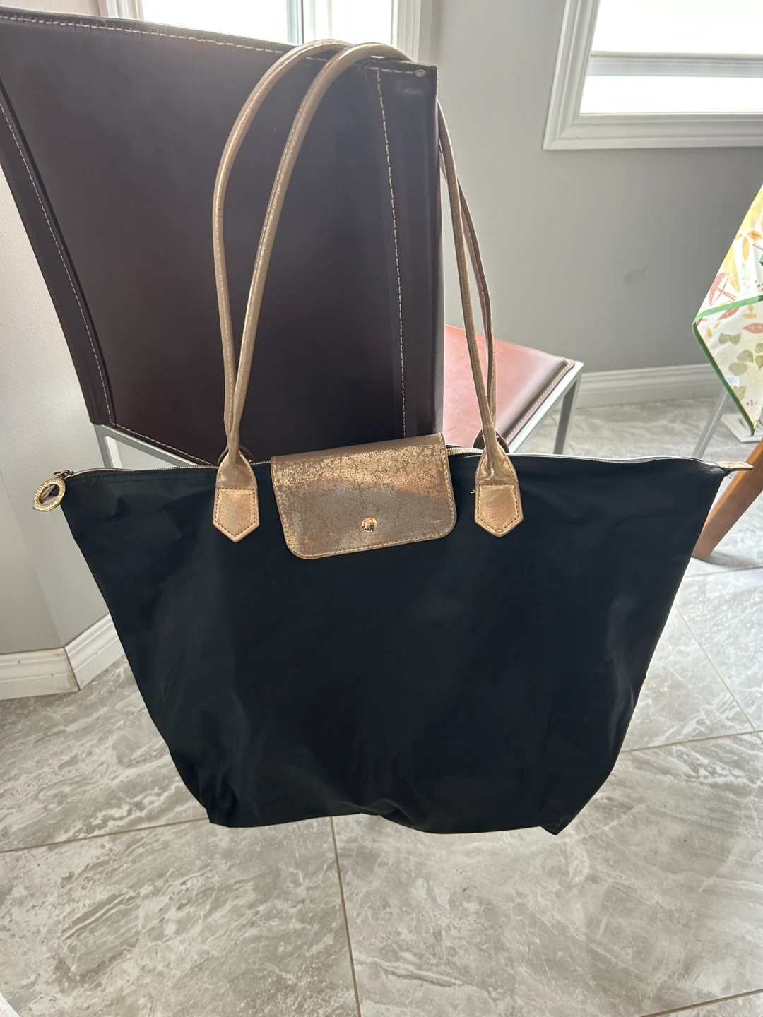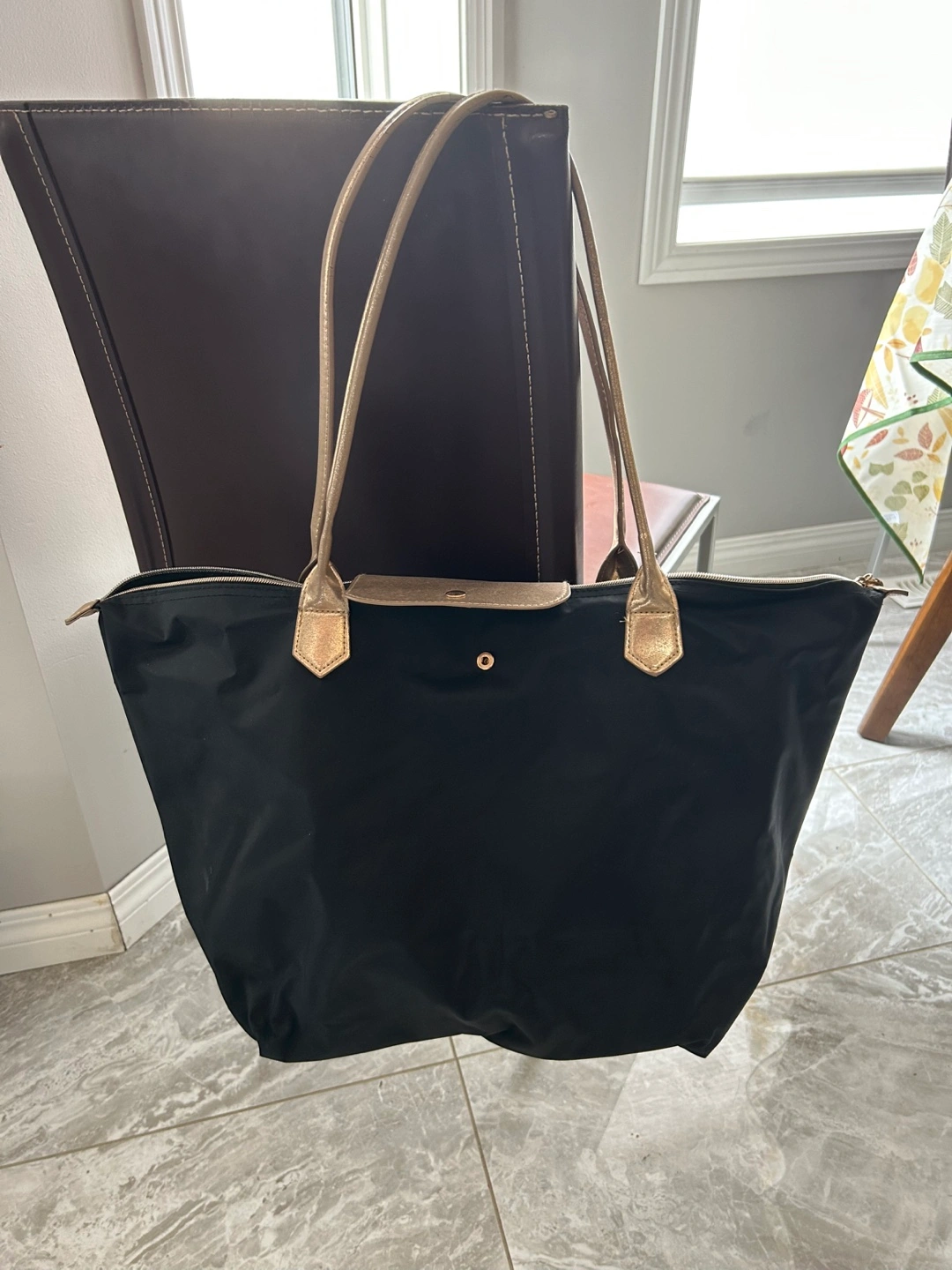 Large black nylon tote bag. Gold-toned leather accents. Top zip closure. Two shoulder straps.