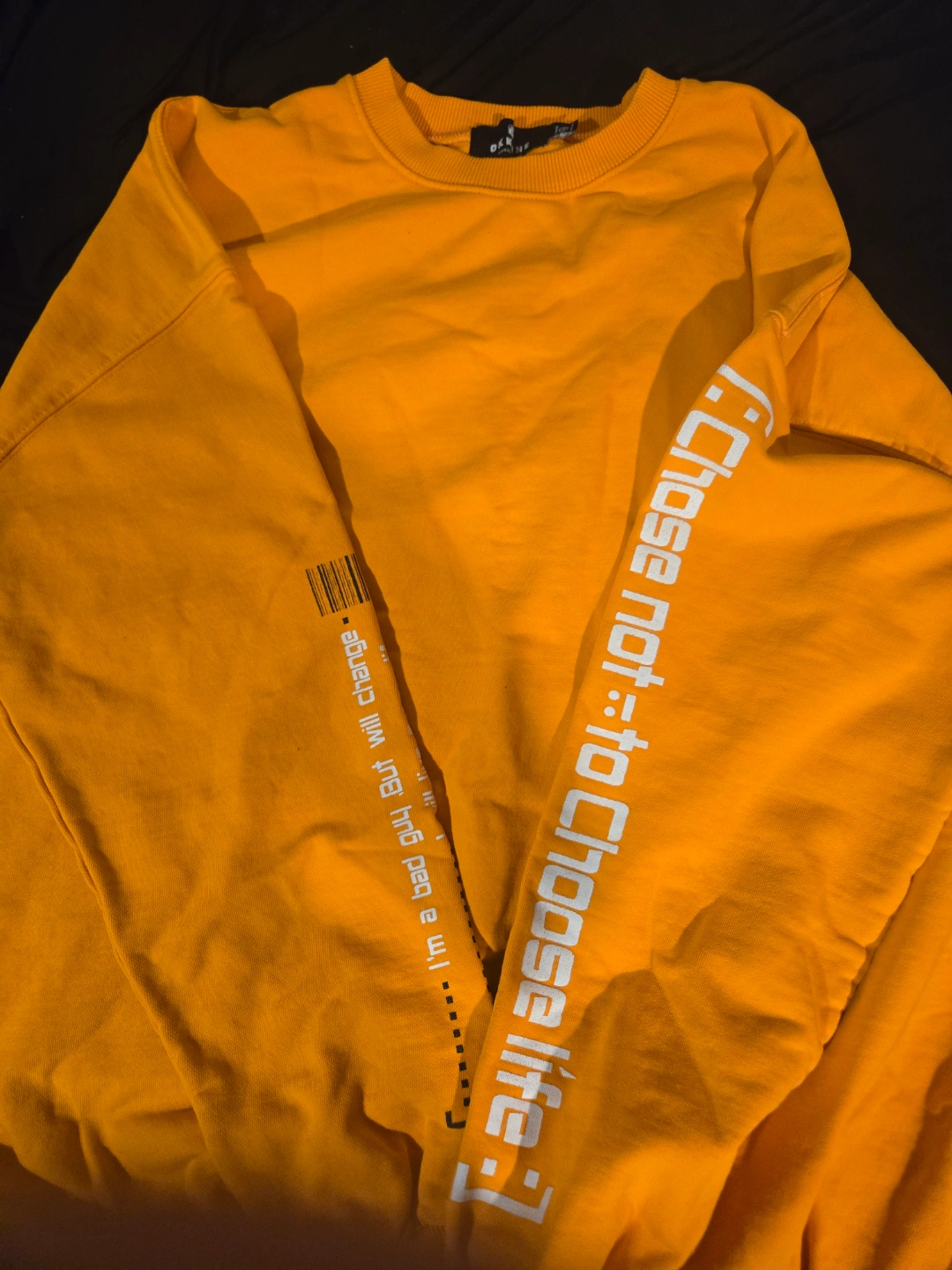 Bright yellow crewneck sweatshirt. Features unique graphic print on sleeves and text. Size XL. Made in Korea.