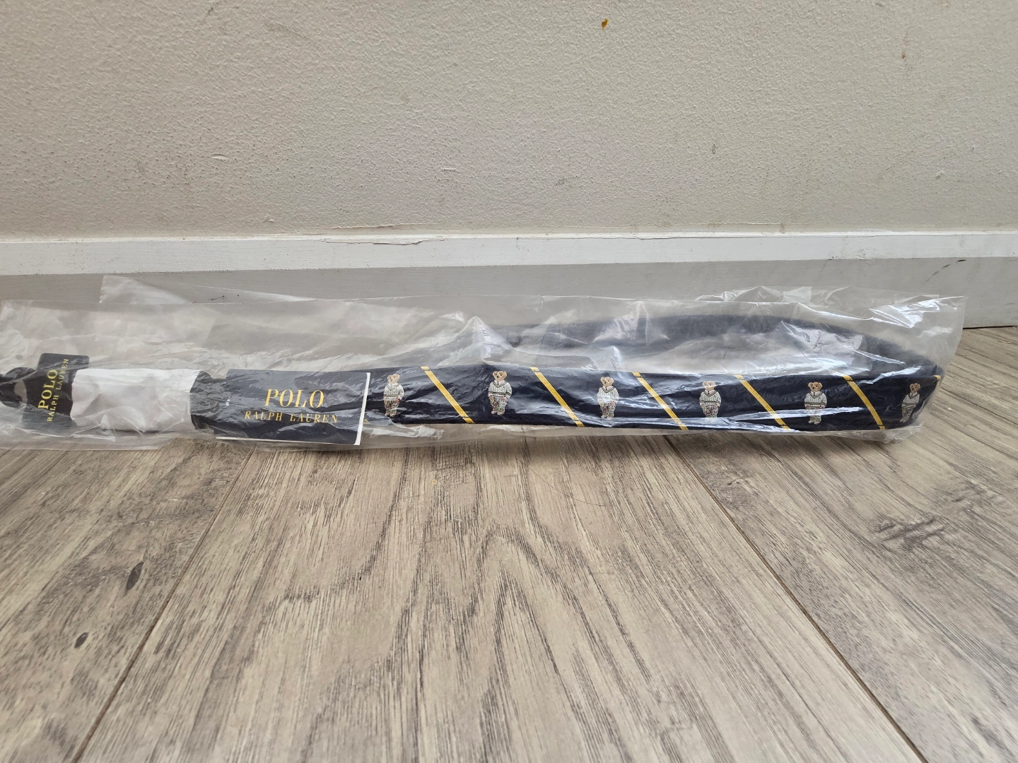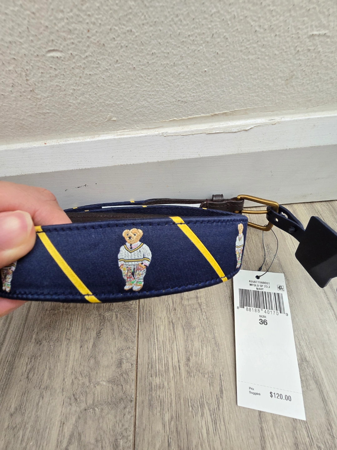 New with tags. Navy blue and gold striped fabric belt. Brown leather. Features a repeating print of bears. Size 36.