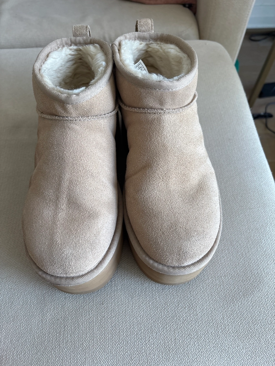 Women's UGG Neumel platform boots. Size 8. Tan suede. Platform sole. Sheepskin lining. Excellent condition. Selling because they’re too big for me. Only worn a couple of times - no defects.