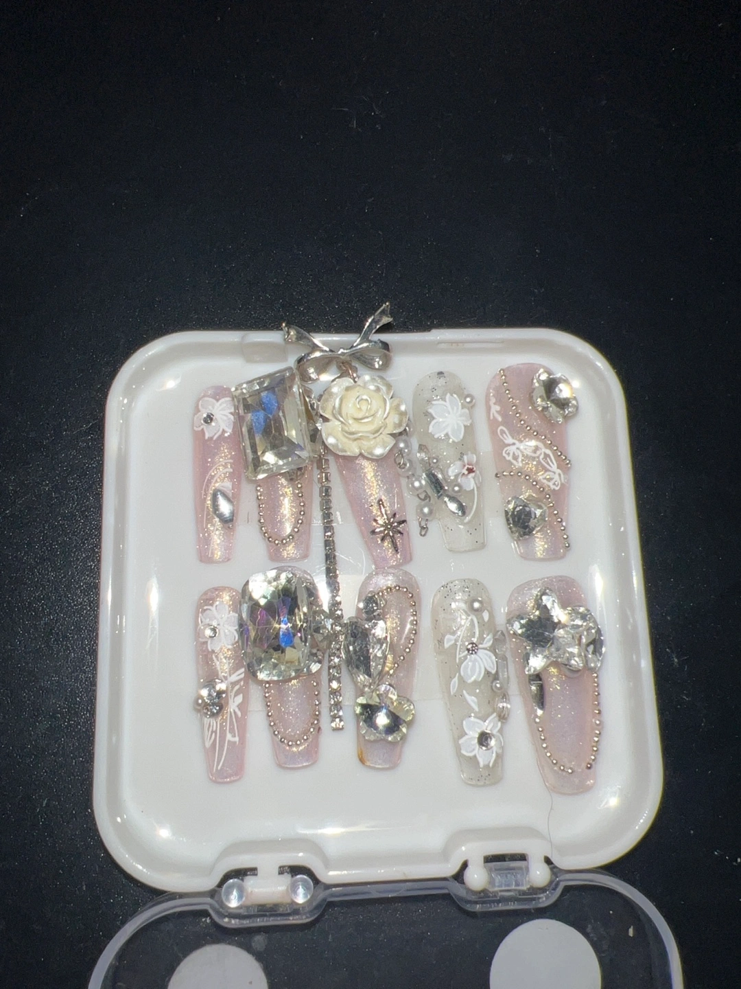 Gorgeous Press-on Nails with Rhinestones and Flowers