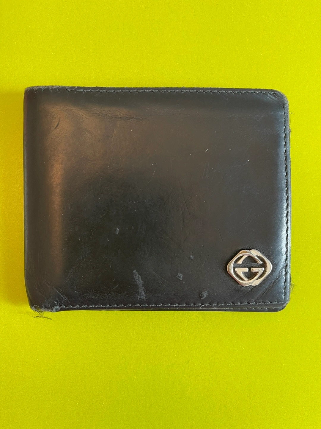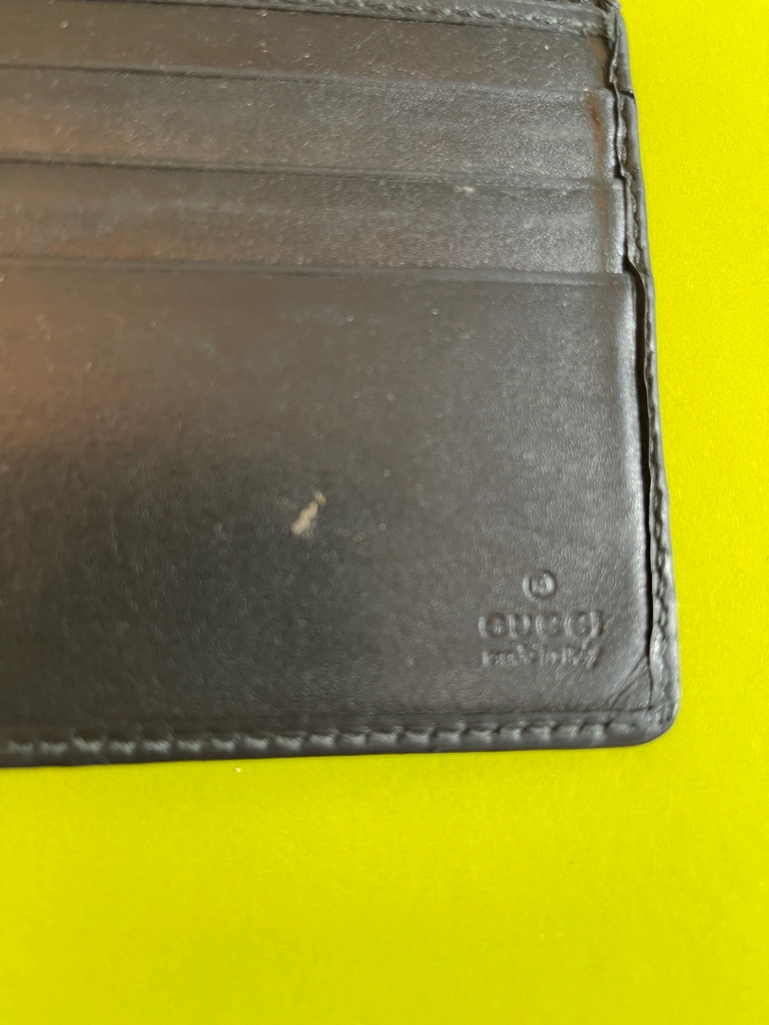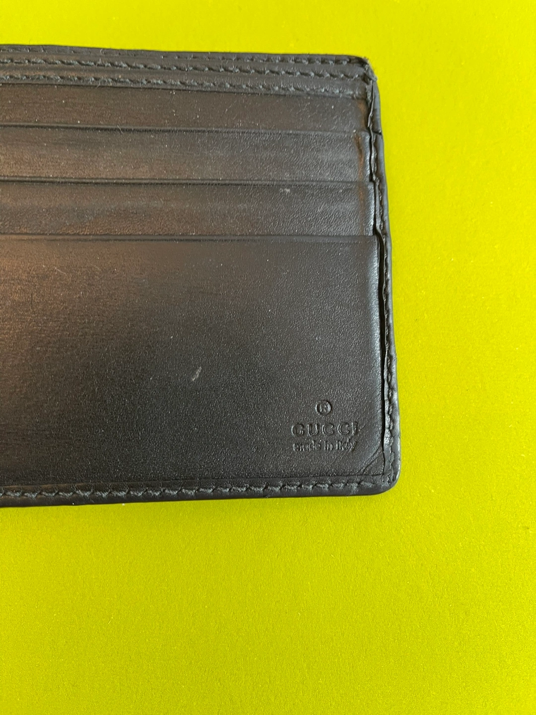 Pre-owned Gucci bi-fold wallet. Black leather. Shows some wear. Multiple card slots and bill compartments. Classic design. Excellent for everyday use.