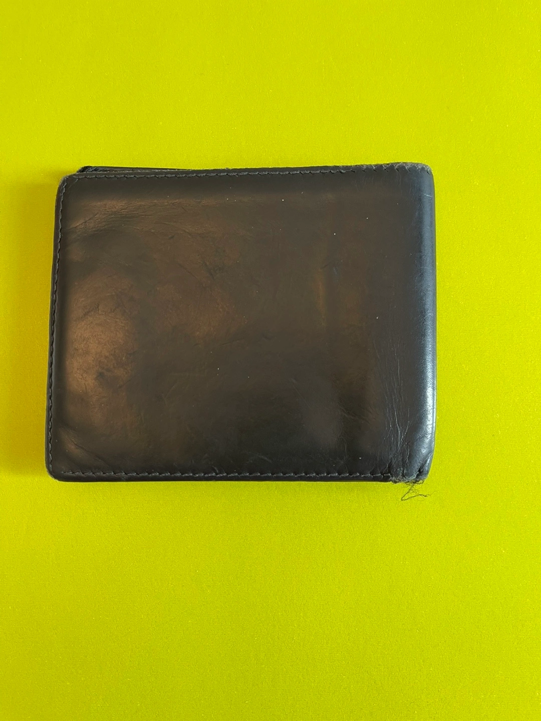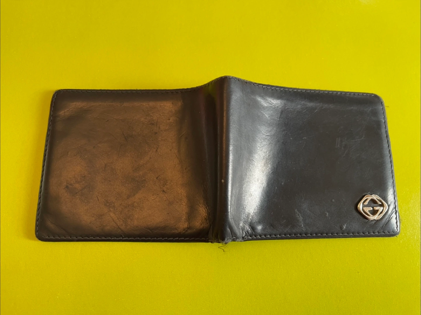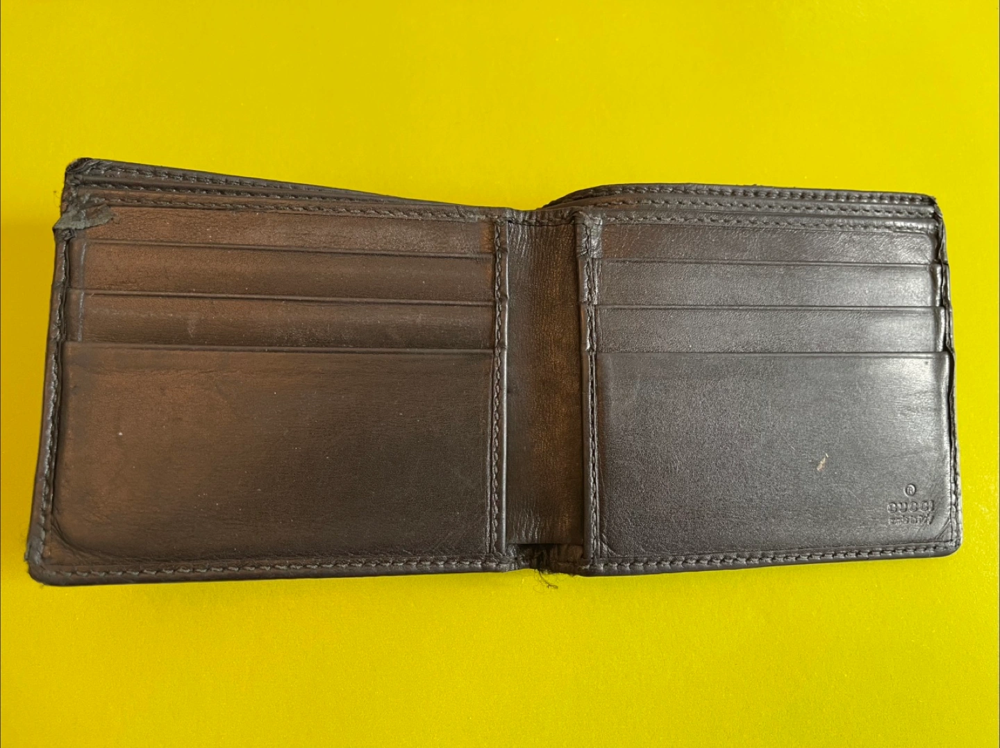 Pre-owned Gucci bi-fold wallet. Black leather. Shows some wear. Multiple card slots and bill compartments. Classic design. Excellent for everyday use.