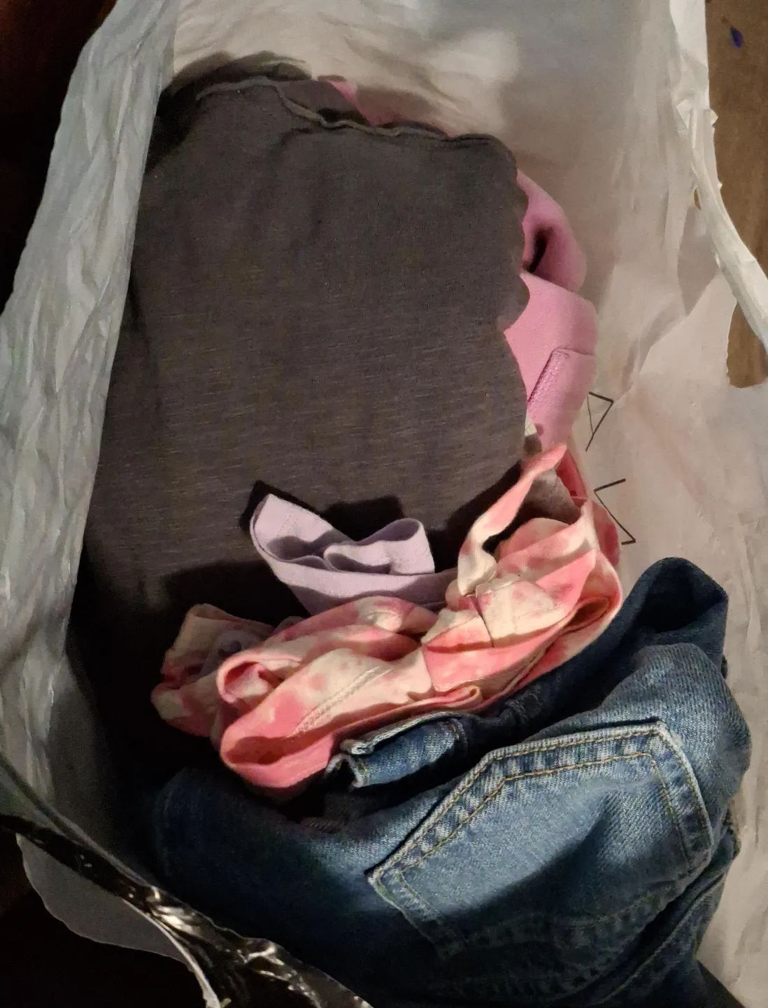 Clothing bundle includes a dark grey long-sleeve shirt, pink tie-dye shirt, lavender shirt, and light wash jeans. All girl's s clothing.
