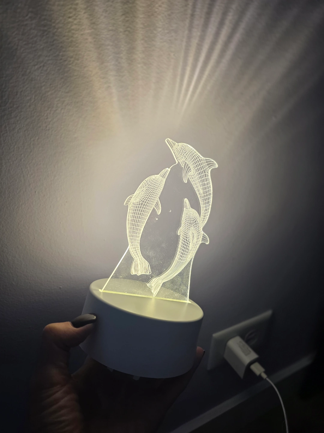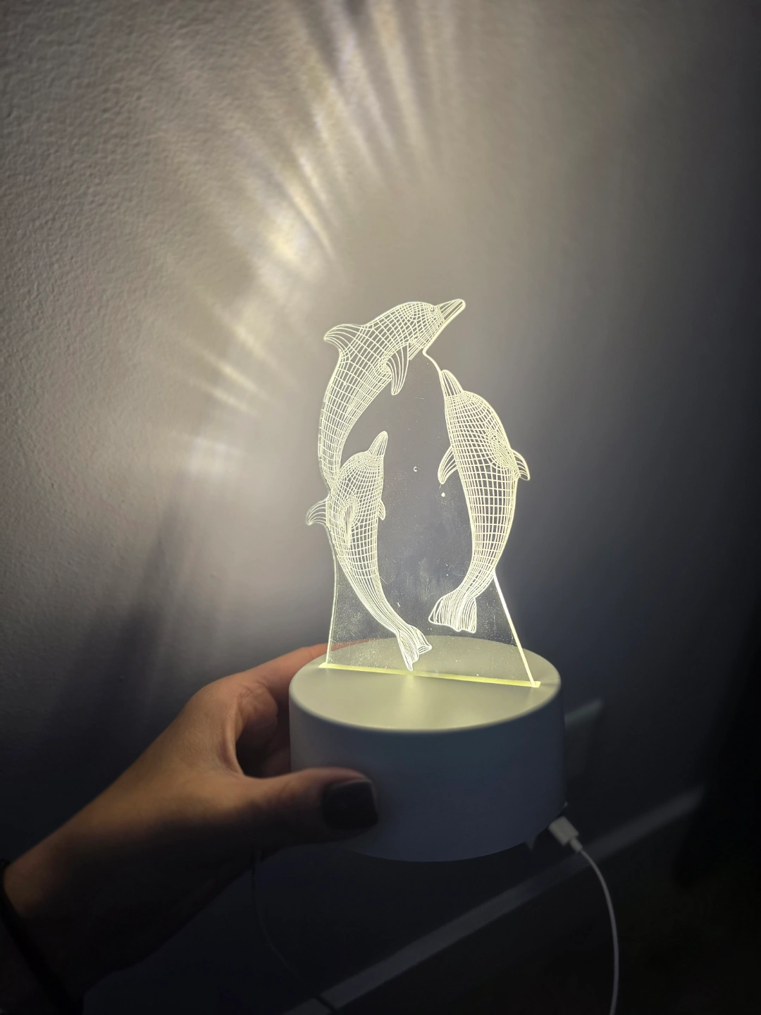 Two 3D illusion night lights. One features the Eiffel Tower, the other three dolphins. Small, LED, and USB powered. Great for bedrooms or as gifts.