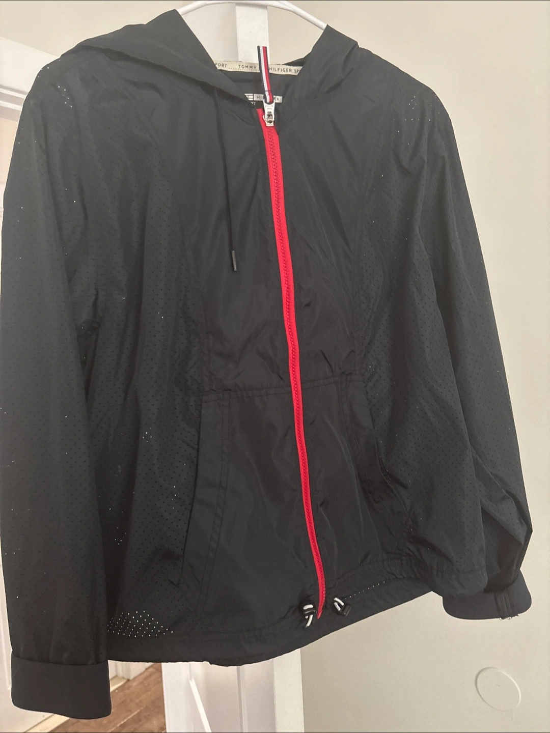 Black lightweight jacket. Features a hood, zip closure, and mesh panels. Great for layering.
