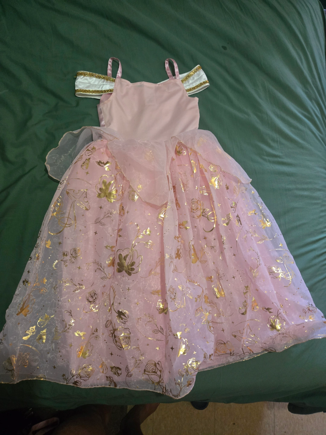 Pink and gold princess dress. Beautiful gown, layered tulle skirt. Sequin bodice. Off-the-shoulder straps. Size Medium.