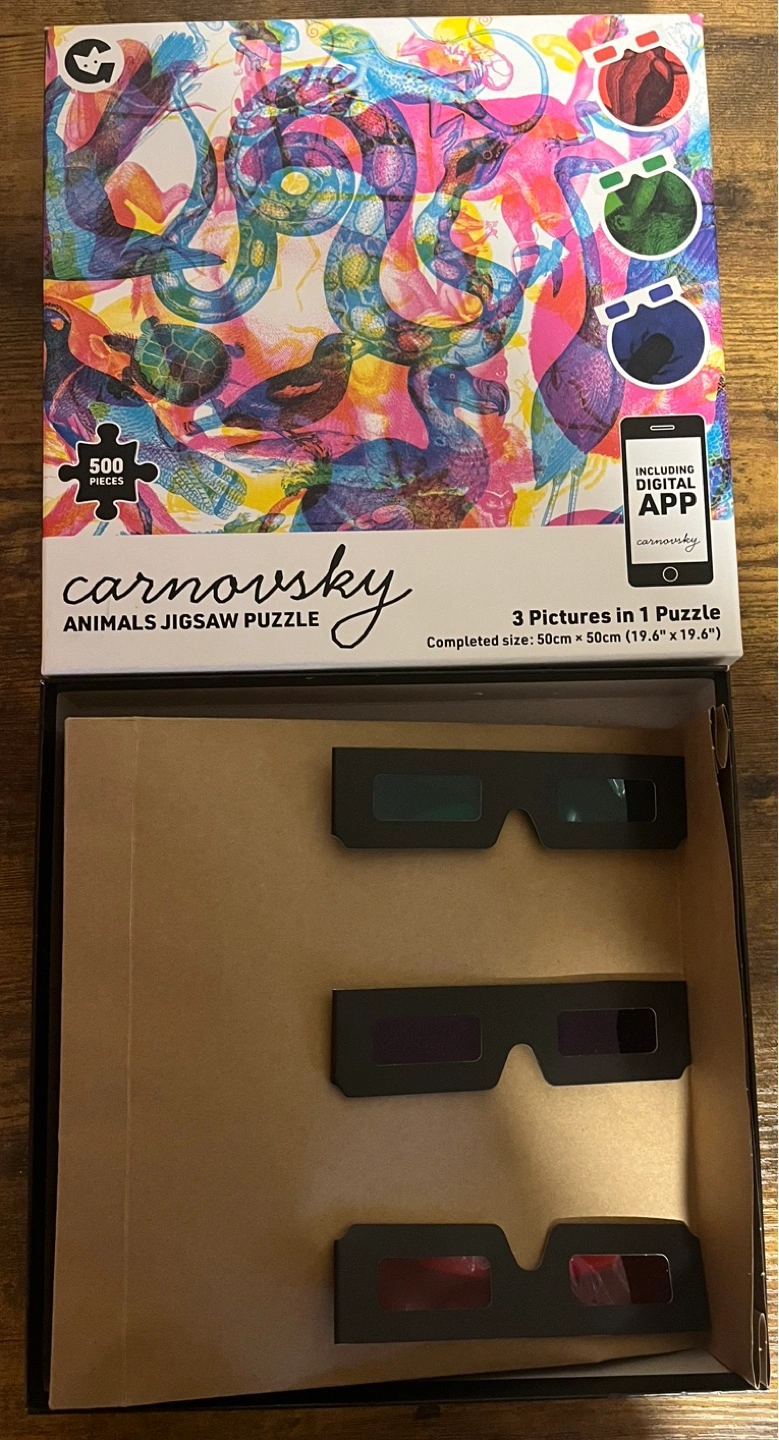 Carnousky 500-piece jigsaw puzzle. Three different images appear depending on the color of glasses used. Includes artwork print and three pairs of 3D glasses. Completed size 50cm x 50cm (19.6" x 19.6").