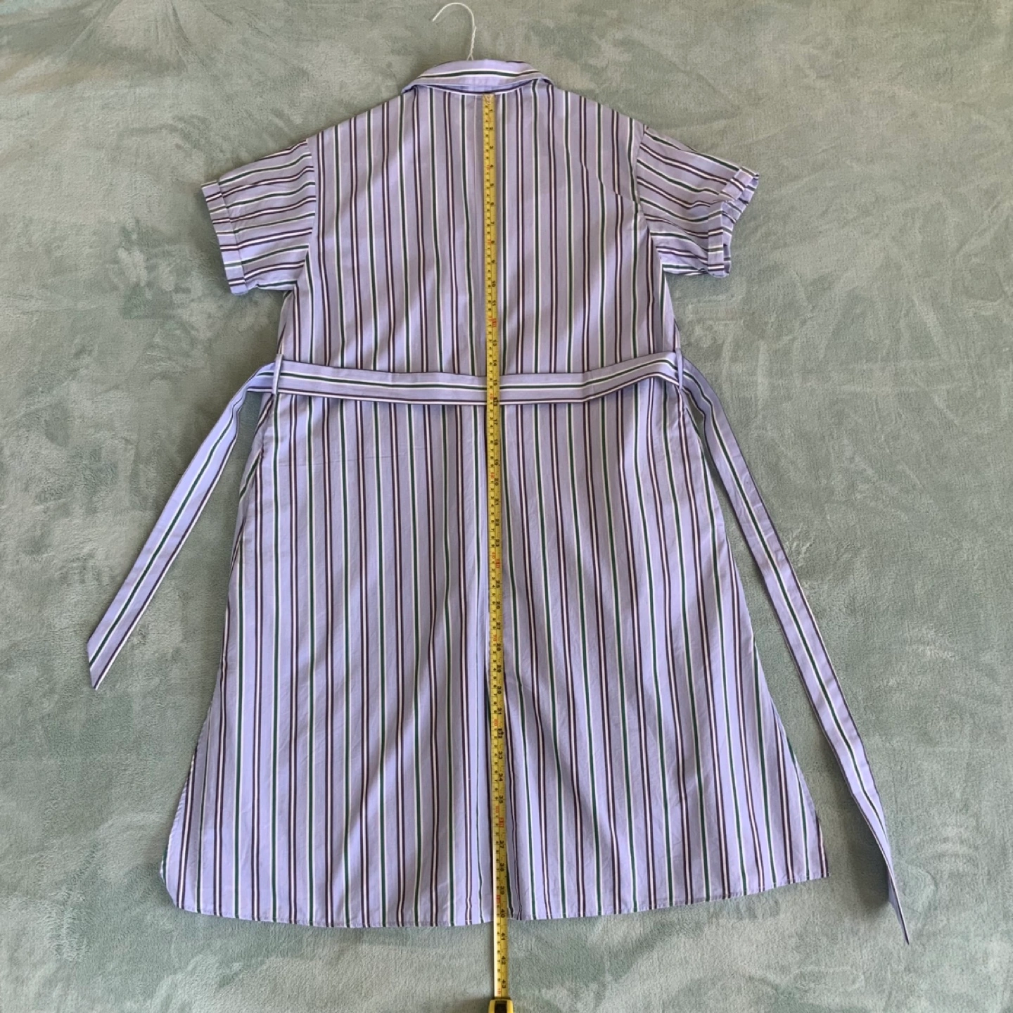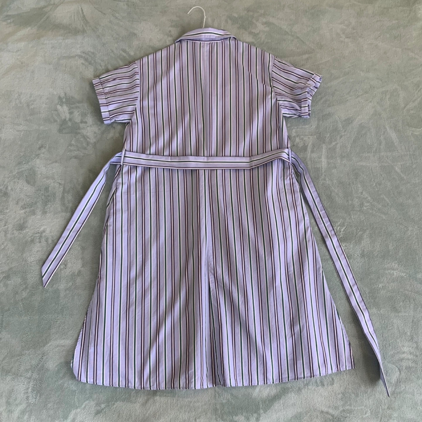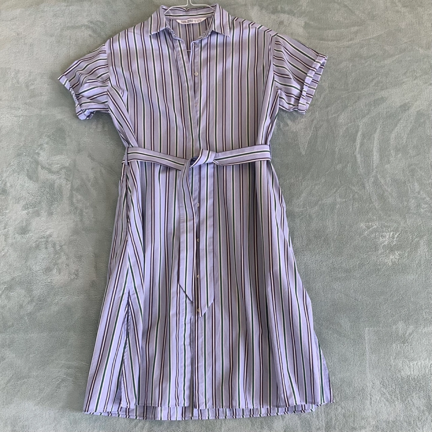 Beautiful trendy vertically striped shirt dress. Short sleeves, collared neckline, and a belted waist. Side pockets.
