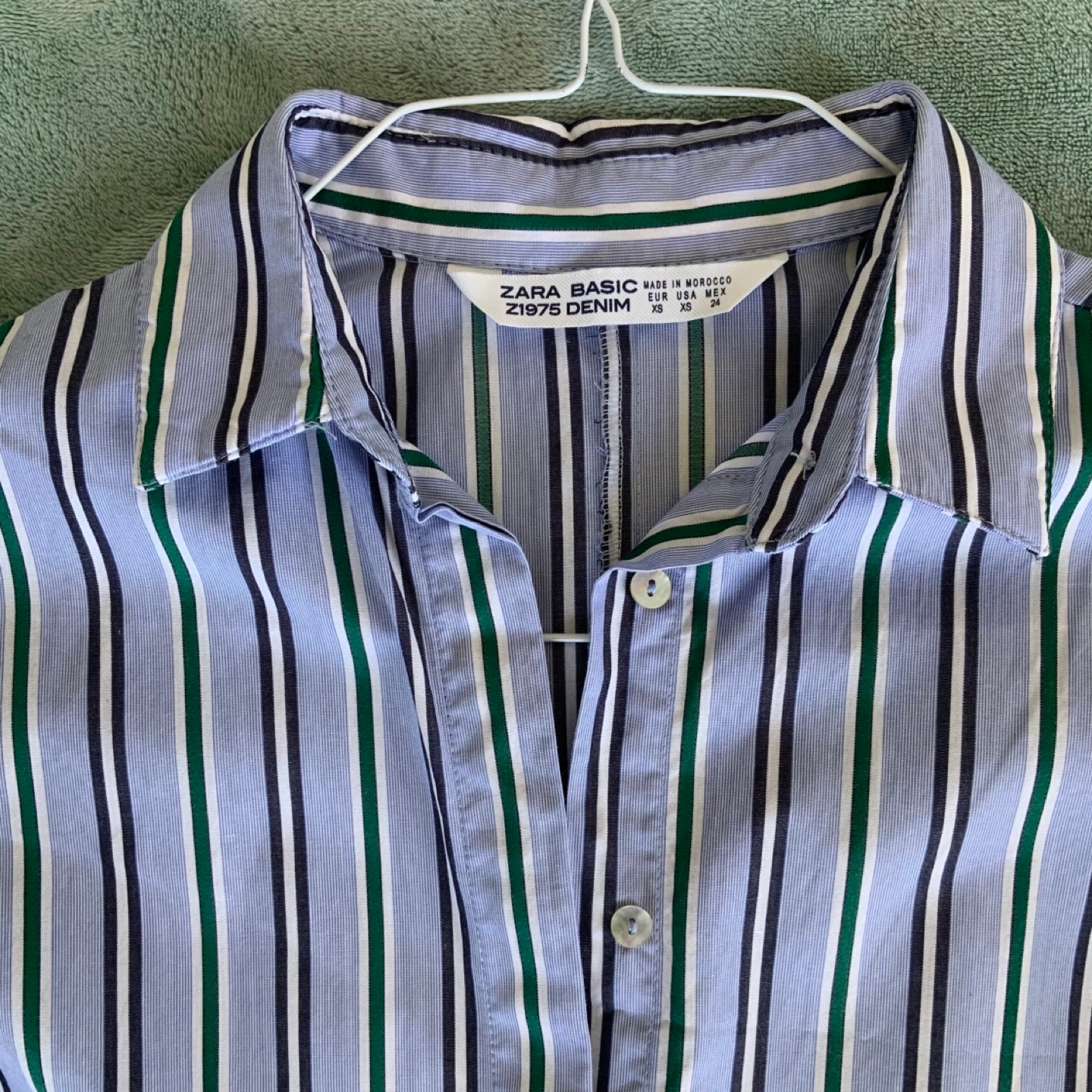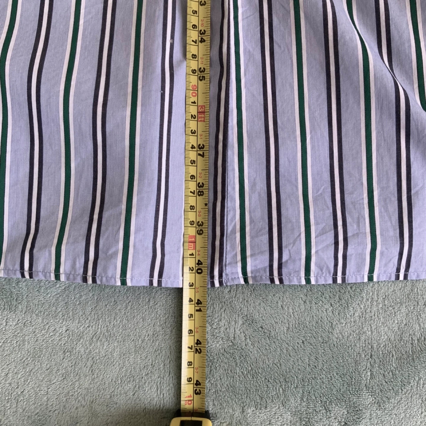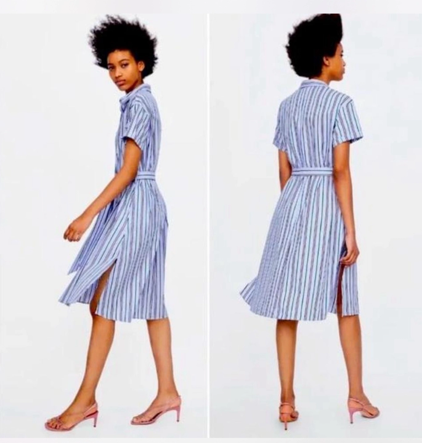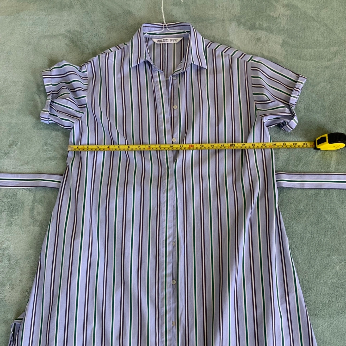 Beautiful trendy vertically striped shirt dress. Short sleeves, collared neckline, and a belted waist. Side pockets.